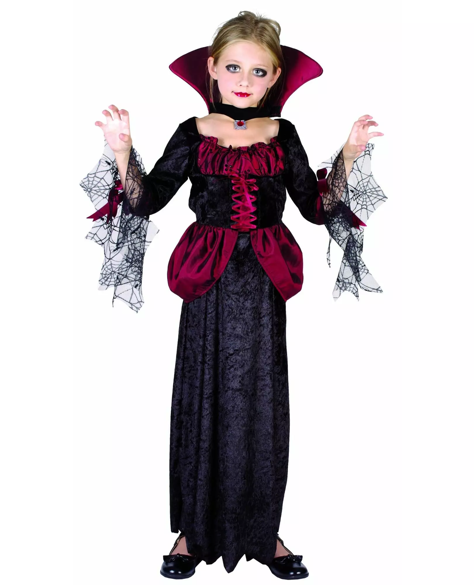 Bli en ekte bloddrikker til Halloween. Dette vampyrkostymet for jenter består av en kjole og en krage (sko og strømpebukser er ikke inkludert). Den lange kjolen er svart. Et rødt stoff gir et hint av farge til halsen og midjen. Rød snøring er også tilstede foran på kjolen. Nederdelen av ermene, som er utsvingt, er laget av svart slør med mønstre som representerer edderkopper og nett. Den store kragen er rød på innsiden. Den festes rundt halsen med et svart pannebånd som gir illusjonen av å ha på seg en choker. Dette kostymet vil være perfekt for å forvandle deg til en skarptannet vampyr til Halloween. Inkludert tilbehør: Kjolekrage Materiale: 100 % polyester Stell: Håndvask Mål: 7–9 år, kjolen måler 108 cm lang 10–12 år, kjolen måler 115 cm lang