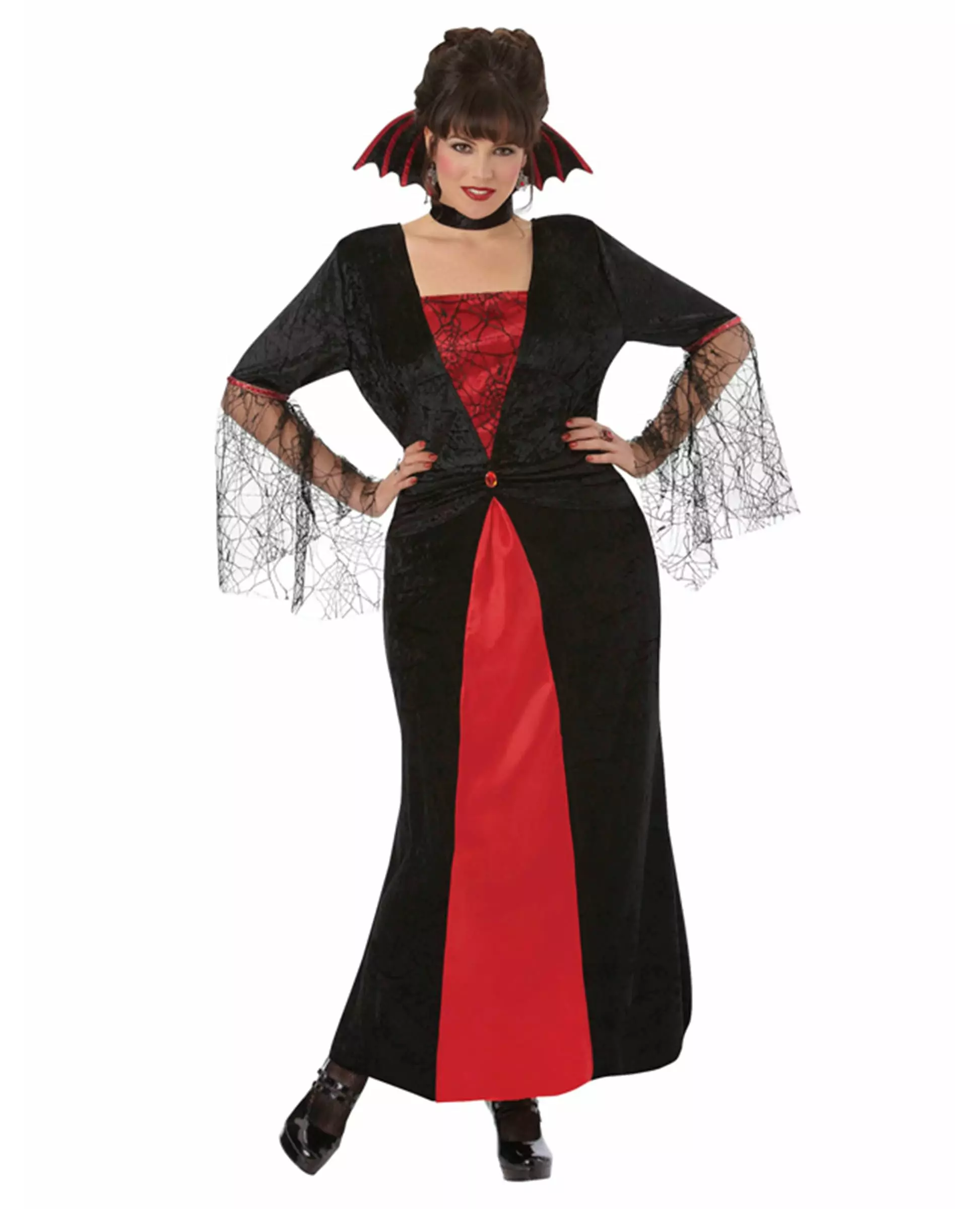 Legemliggjør en storslått vampyr til Halloween! Dette svart-røde vampyrkostymet er for kvinner og består av kjole og choker (sko, strømpebukser og øredobber er ikke inkludert). Kjolen er rød i midten og svart med fløyelseffekt på sidene. Spindelvev er trykt i svart på toppen av kjolen. Ermene er lange og vide med en gjennomsiktig svart del som ligner spindelvev. En rød juvel pryder midten av midjen. En svart choker fullfører kostymet ved å gå opp til bakhodet. Vær den mest elegante med dette røde og svarte vampyrkostymet til Halloween-festen din!. Inkludert tilbehør: Kjole Halsvarmer Materiale: 100 % polyester Vedlikehold: Håndvask