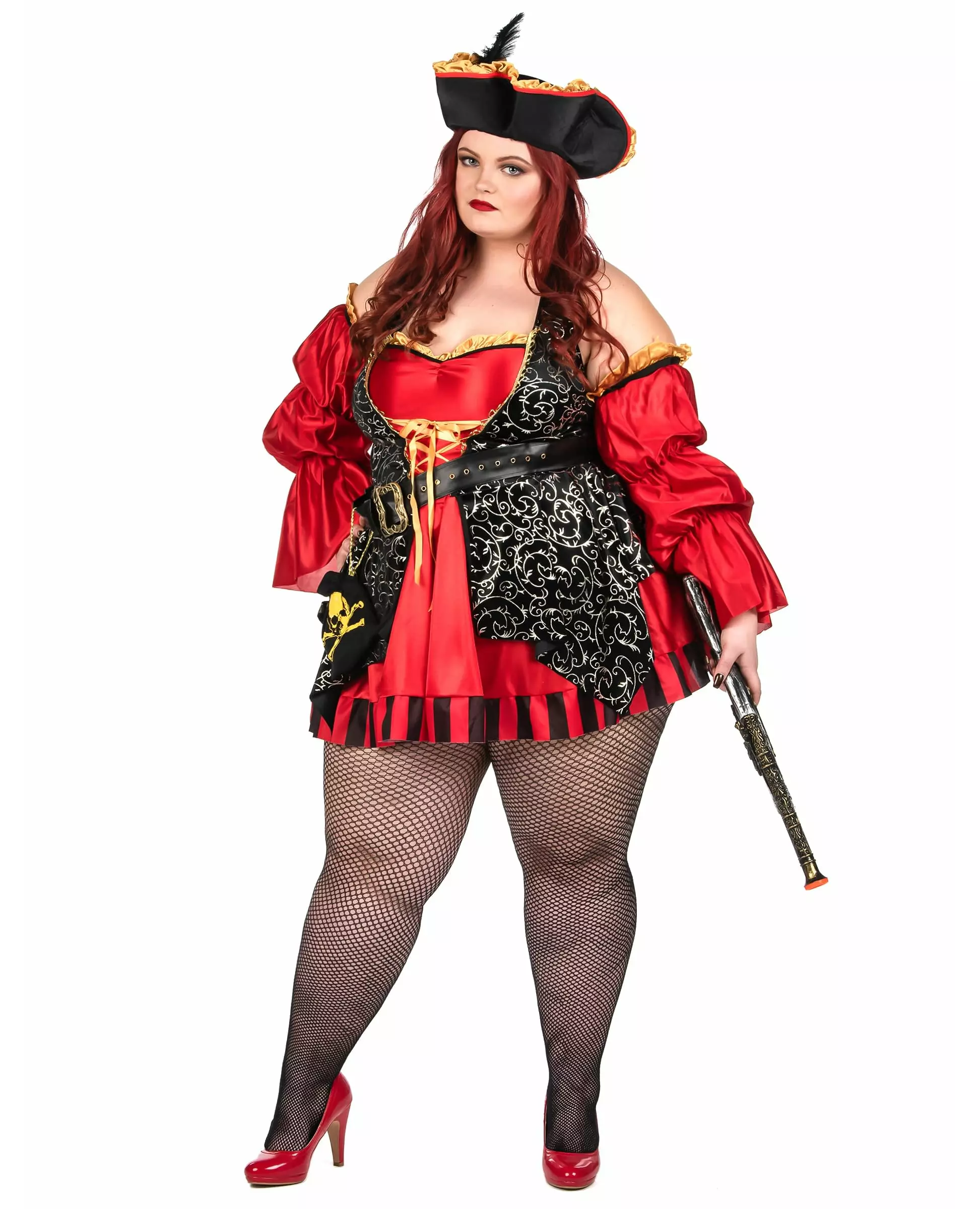 Splitt havene! Dette piratkostymet for kvinner består av en kjole, to ermer, en hatt, et belte og en veske. Den korte, tettsittende kjolen har en veldig lav utringning. Foran vil den satenggyldne snøringen fremkalle et korsett og lar deg fremheve bysten din slik du ønsker. På sidene av overdelen vil to strimler av svart fløyelsstoff fremheve silhuetten din og kan enkelt knytes bak nakken. Fløyelen er dekorert med skinnende, gullfargede barokkmønstre. Kjolens underside er laget av to lag stoff. Det nederste laget er satengrødt med svarte og røde rysjer for å ligne et underskjørt. Det øverste laget er et stykke svart fløyelsstoff dekorert med gullmotiver (tyllunderskjørtet selges separat). For å pynte armene dine følger det med to puffermer. De er laget av rødt satengstoff. Med strikk på tre steder kan du bearbeide stoffet for å skape den effekten du ønsker. Hatten er en trekantet hatt laget av svart satengstoff med røde og gullfargede kanter. Den vil passe en hodeomkrets på rundt 59 cm. Et satenggullbånd vil bli bundet, og en svart fjær er montert på toppen av hodeplagget. Til slutt kan du markere midjen din takket være et belte med plastspenne. Det er svart og utseendet minner om lær. Du kan henge den medfølgende vesken på den. Den er svart med en gyllen hodeskalle. Med dette svært komplette kostymet vil du være kapteinen på kostymefesten eller karnevalet! Inkludert tilbehør: Dresshatt, 2 ermer, belte, veske. Materiale: 100 % polyester. Vedlikehold: Håndvask.