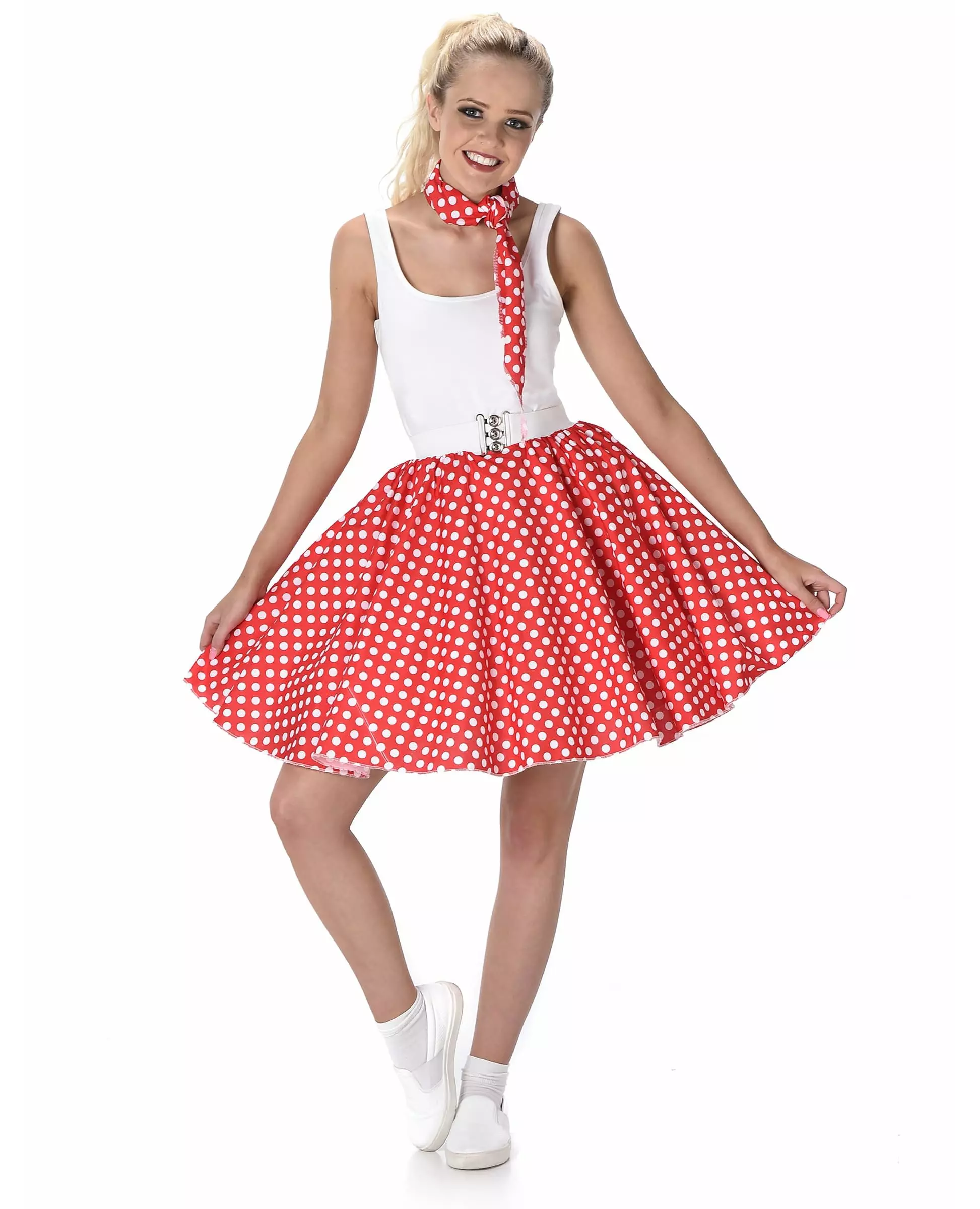 Total 50-tallslook! Dette 50-tallskostymet for kvinner inkluderer et skjørt og en bandana. Det puffede skjørtet er rødt med hvite prikker, det er fôret og et bredt belte med sølvspenne er sydd i midjen for å tilpasse seg alle kroppsformer. Bandanaen som matcher skjørtet er tilbehøret som vil gjøre forskjellen og gi et elegant preg. Dette 50-tallskostymet er ideelt for å se best mulig ut på en 50-tallsfest! Inkludert tilbehør: Bandanaskjørt Materiale: 100 % polyester Vedlikehold: Håndvask