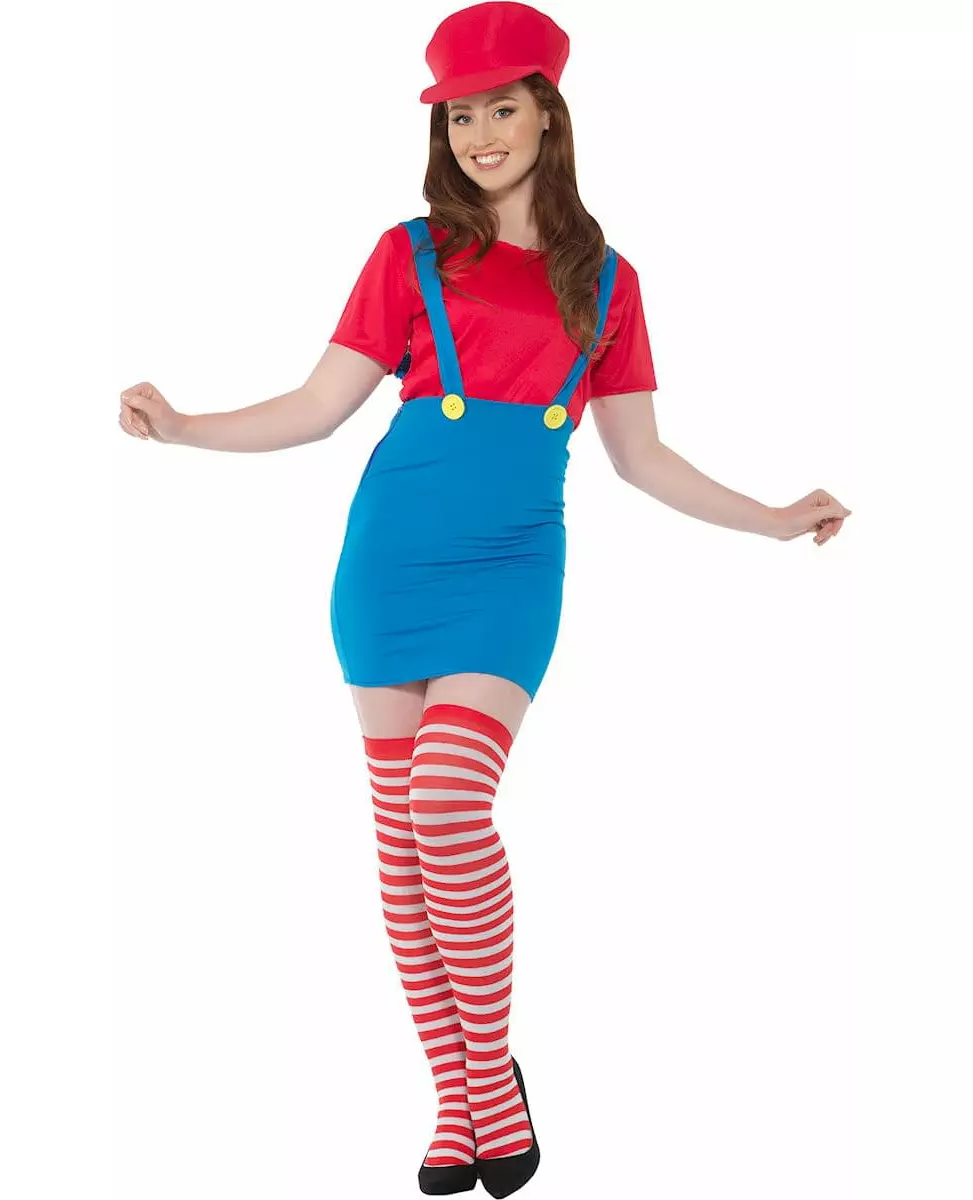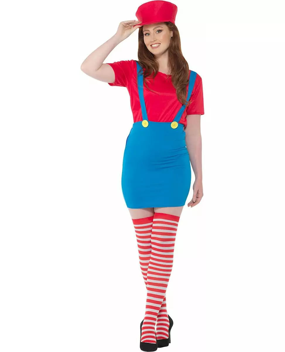 Spill som en videospillhelt i dette røde rørleggerkostymet. Dette røde rørleggerkostymet for kvinner består av et skjørt, en t-skjorte, en lue og strømper. Det høye skjørtet er blått med to stropper. Det er dekorert med gule knapper nederst på stroppene. Den kortermede t-skjorten er rød. Den matchende luen har samme farge. De hvite og røde strømpene pynter kostymet. Dette røde rørleggerkostymet vil være perfekt for å ta deg med som en videospillheltinne på karnevalet. Inkludert tilbehør: Skjørt, T-skjorte, lue, strømper Materiale: 100 % polyester Pleie: Håndvask