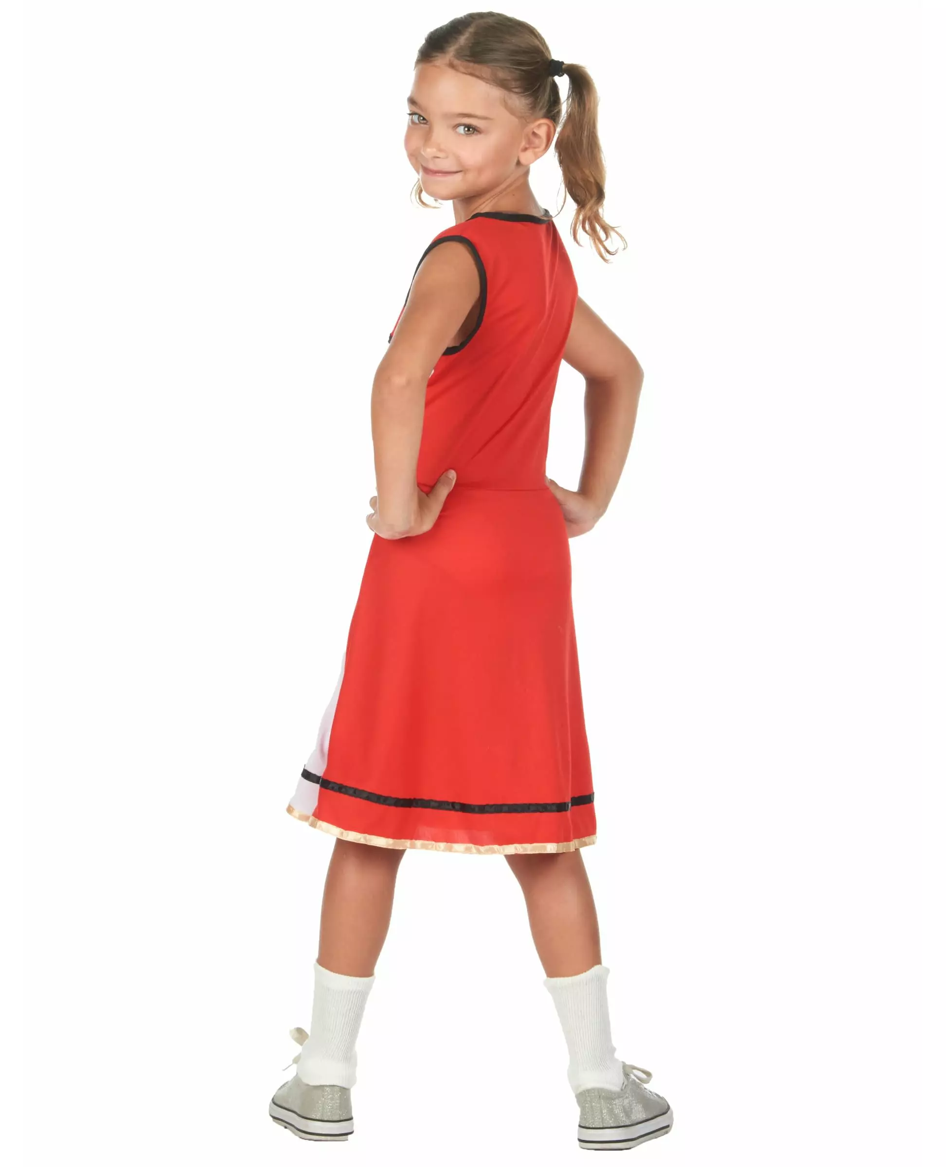 En ung supporter! Dette cheerleader-kostymet fra USA er for jenter. Det inkluderer en kjole, selges separat. Kjolen er rød og hvit. Den er kantet med svarte kanter på øyevippene, hoftene og baken. USA-innskriften er plassert midt på overkroppen i rødt og gull. Til slutt gir pene gullkanter på hoftene og baken kjolen karakter. Dette cheerleader-kostymet vil være ideelt for en skolefest, et karneval eller en kostymefest med uniformtema. Materiale: 100 % polyester. Inkludert tilbehør: Klespleie: Håndvask