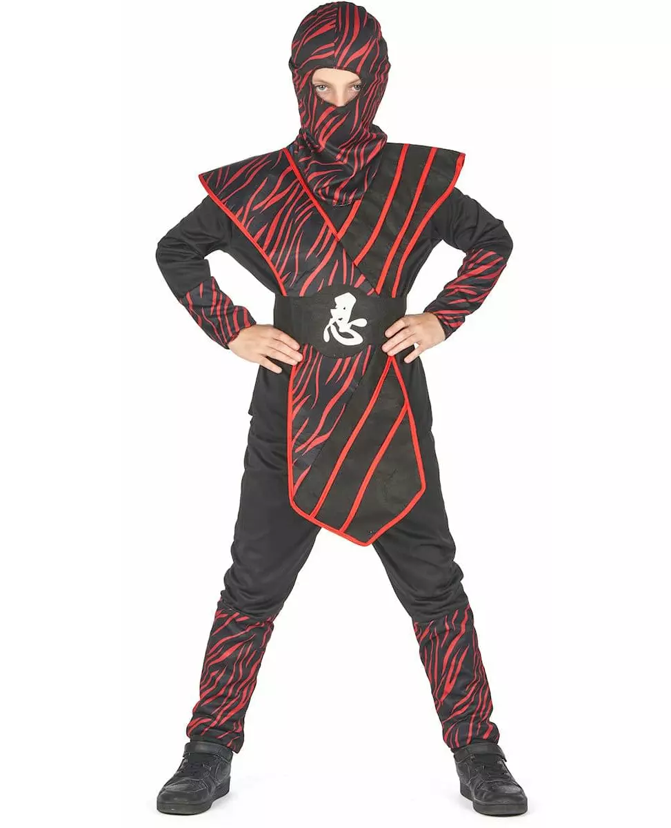 Lær å bli en ninja. Dette ninja-kostymet for gutter består av en topp, bukser, en hette, en brystbeskytter og et belte (sko ikke inkludert). Toppen og buksene er svarte, med røde tigerstriper i endene. Toppen lukkes bak med borrelås, og buksene har en elastikk i midjen. Brystbeskytteren er svart og rød. Den holder seg på plass ved hjelp av beltet. Dette beltet er svart med et hvitt kinesisk symbol. Det lukkes med en bred borrelås. Hetten er svart og rød. Den har en åpning for øynene. Dette ninja-kostymet vil være perfekt til karneval. Inkludert tilbehør: Topp, bukser, forstykk, belte, hette. Materiale: 100 % polyester. Vedlikehold: Håndvask. Målinformasjon: For størrelse 3/4 år (XS), topp ca. 39 cm lang og bukser ca. 55 cm lang.