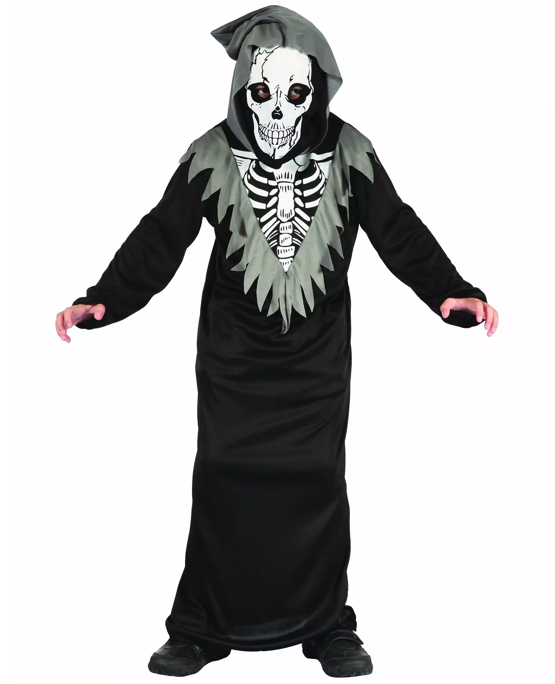 Skrekk vennene dine i dette skjelettkostymet. Dette skjelettkostymet for gutter består av en kjole med hette og en balaklava (sko ikke inkludert). Kjolen er svart med lange ermer. Grå tupper er på brystet. Et hvitt ribbein er trykt på forsiden av kjolen. Hetten er grå. Denne hettekjolen lukkes øverst på ryggen med borrelås. Balaklavaen er svart, med en hodeskalle trykt på forsiden. Det er åpninger ved øynene. Dette kostymet vil være perfekt for å forvandle seg til et skummelt skjelett på Halloween-kvelden. Inkludert tilbehør: Kjole Hette Materiale: 100 % polyester Pleie: Håndvask