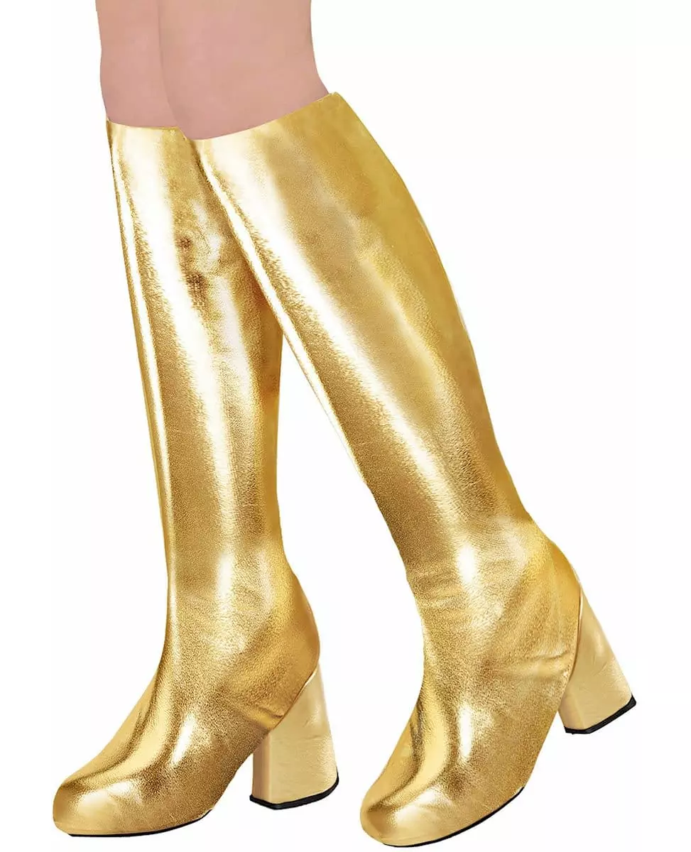 Gi diskokostymet ditt et elegant preg. Disse støvelovertrekkene for kvinner er i gull. De kler leggene dine godt siden de går opp til under knærne. De har også en åpning slik at du kan ta ut hælen av dine egne sko. Disse gullfargede støvelovertrekkene vil være perfekte for å fullføre diskokostymet ditt til karneval. Inkludert tilbehør: 2 støvelovertrekk Materiale: 100 % polyester Pleie: Håndvask