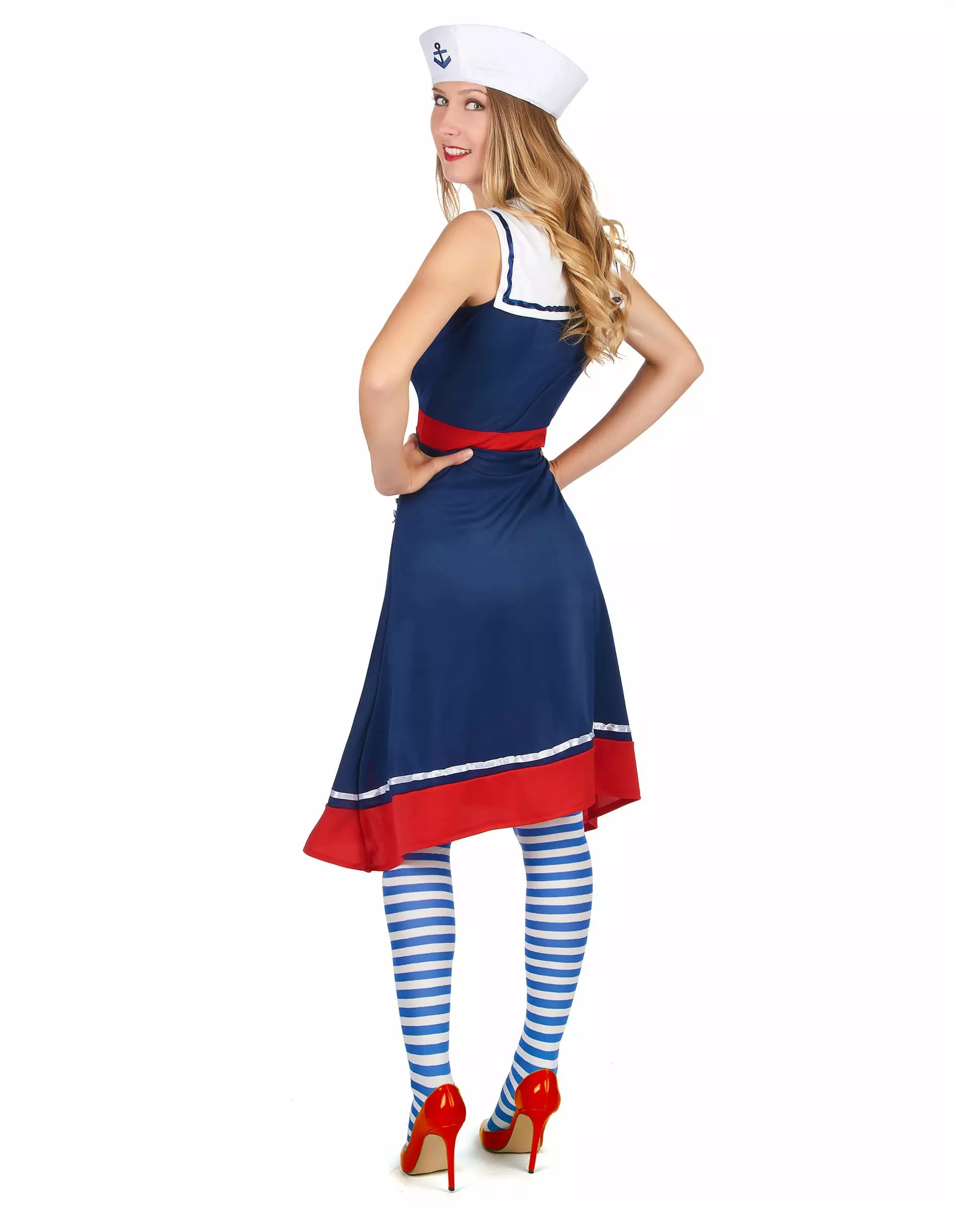 Bli en ekte sjømann i dette kostymet. Dette sjømannskostymet for kvinner består av en kjole og en hatt (strømpebukser og sko er ikke inkludert). Den ermeløse kjolen er marineblå. Den er dekorert med røde striper og en hvit kant. Et anker er også tilstede i livet. Sjømannshatten er hvit med et blått anker foran. Dette sjømannskostymet vil være perfekt til ditt neste karneval eller uniformtemafest. Inkludert tilbehør: Dresshatt. Materiale: 100 % polyester. Pleie: Håndvask.