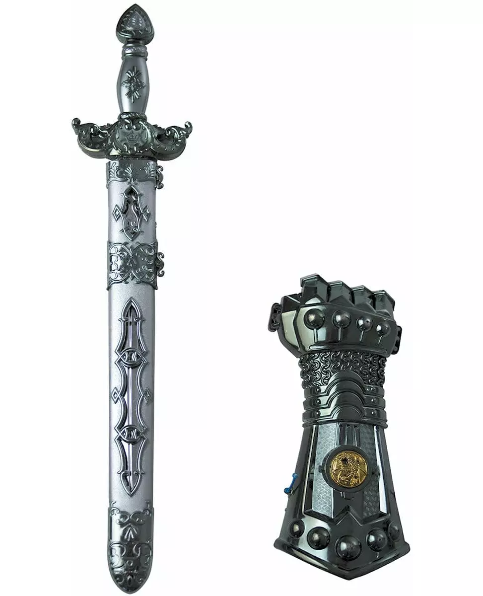 Sett deg ned rundt det runde bordet! Dette settet inneholder et sverd og en ridderhanske laget av stiv plast. Sverdet leveres med slire. Laget av grå plast og dekorert med forskjellige mønstre. Det måler omtrent 49 cm langt. Hansken dekker bare den øvre delen av hånden og armen. Laget av stiv plast og holdes på plass med en strikk på armen og et håndtak på hånden. Det måler omtrent 26 cm langt. Dette settet vil være ideelt for å fullføre barnets ridderkostyme på karneval eller en kostymefest! Inkludert tilbehør: sett med sverd og hanske Materiale: Plast