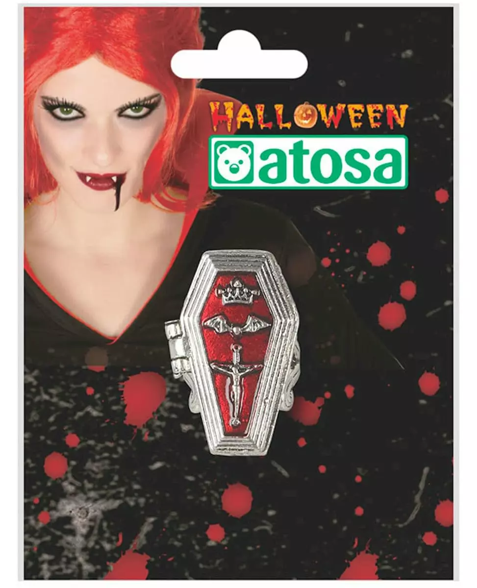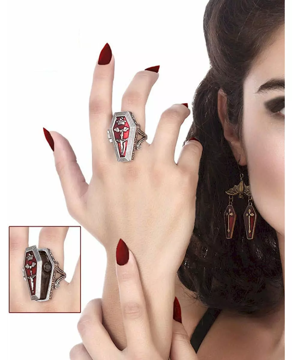 Skjul hemmelighetene dine godt med denne ringen! Denne vampyrringen for kvinner er laget av metall. Den forestiller en rød og sølvfarget kiste som kan åpnes! Du kan skjule falskt blod, vampyrtennene dine ... Denne ringen vil fullføre vampyrkostymet ditt til Halloween på en original måte. Inkludert tilbehør: 1 ring Materiale: Sink