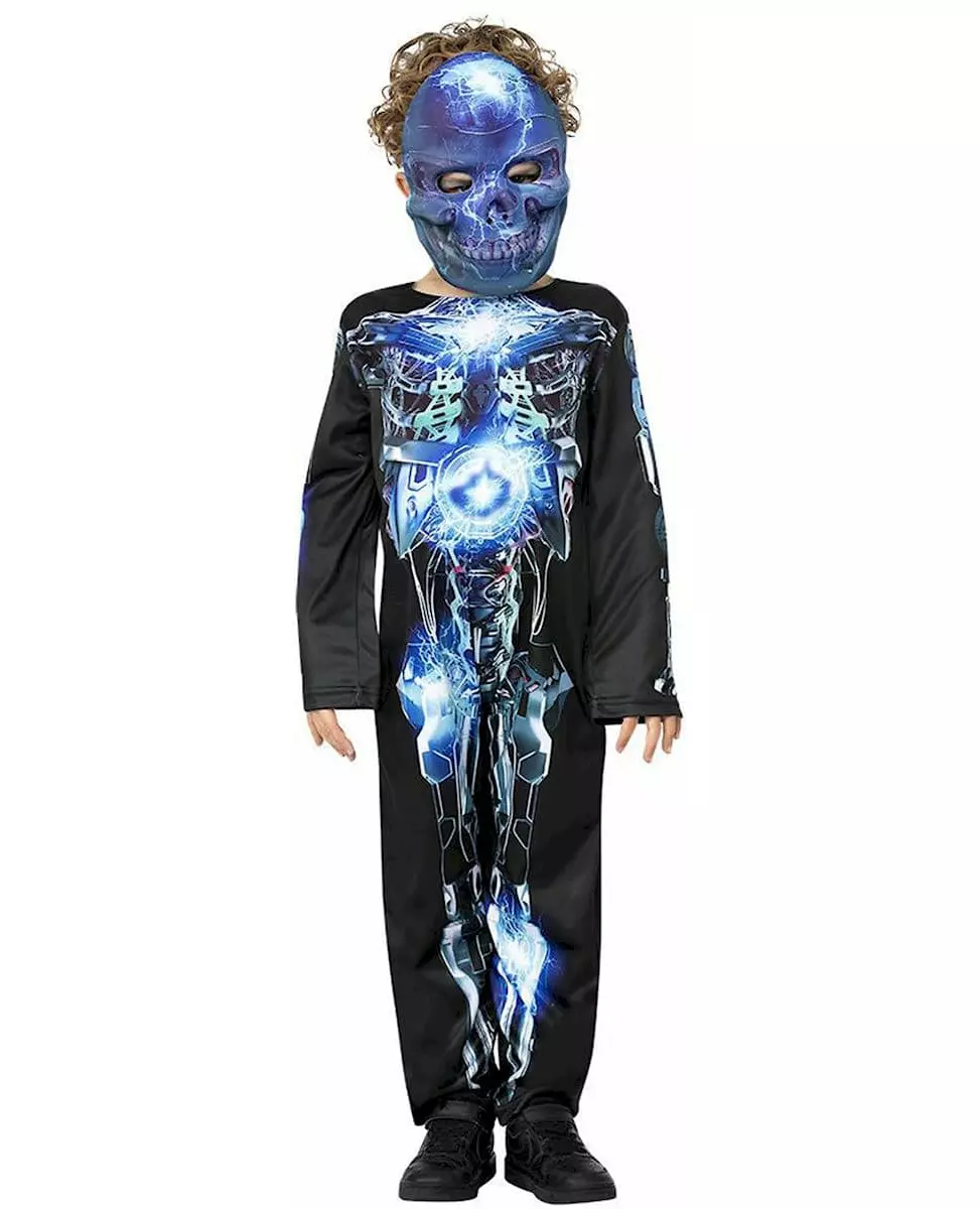Skummel robotskjelett! Dette robotskjelettkostymet er for barn og består av en maske og en jumpsuit. Jumpsuiten har lange ermer og er svart. Den er trykt med et blått robotskjelett med neoneffekt på forsiden og ermene. Halvmasken representerer hodeskallen til et skjelett i blåtoner. Den er laget av EVA som gir den et gummiaktig utseende. Den har en strikk bak for å holde den enkelt på plass. Velg et skummelt kostyme til barnet ditt med dette robotskjelettkostymet til Halloween!. Inkludert tilbehør: Jumpsuit-maske Materiale: Polyester og EVA Stell: Håndvask