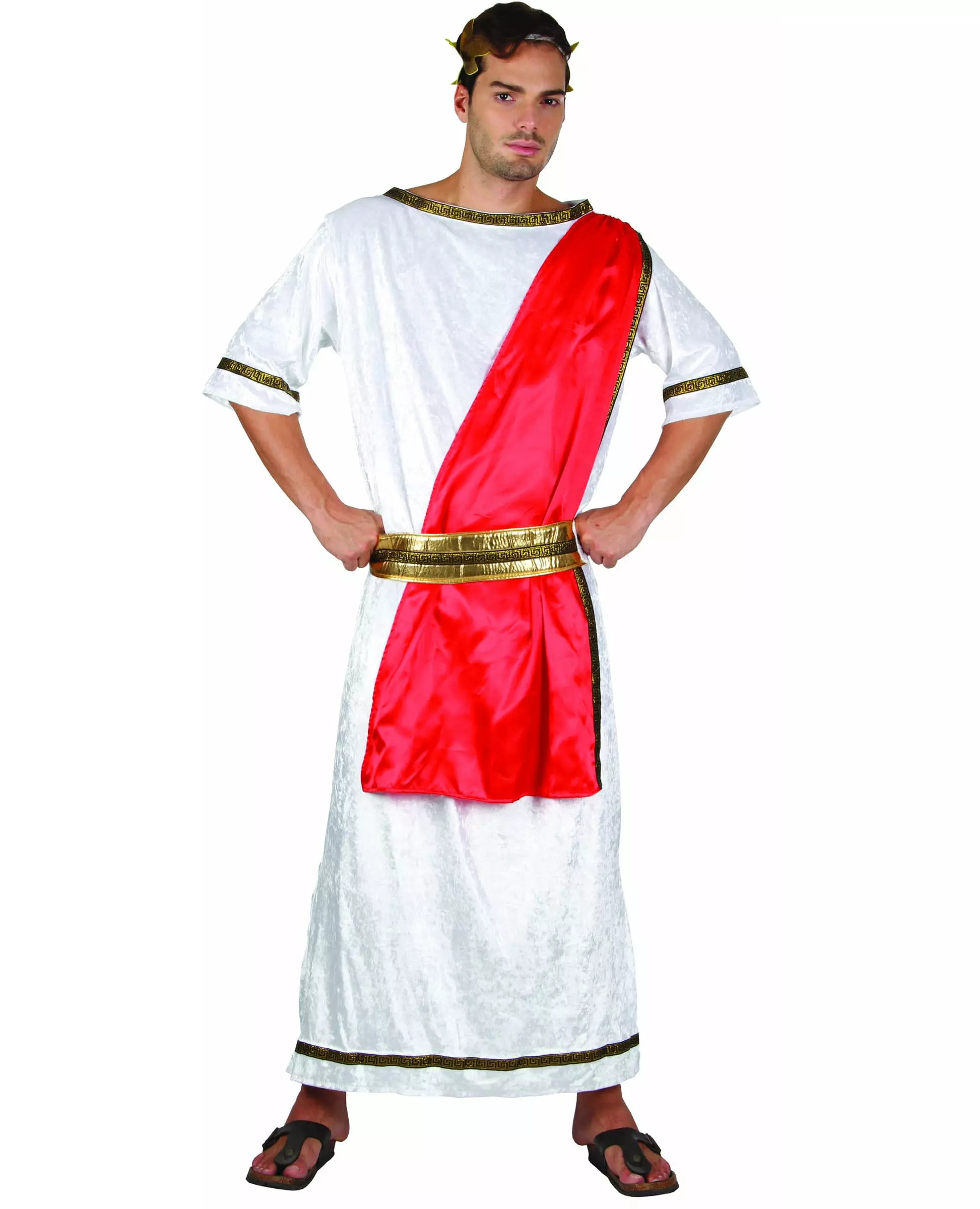 Hil Cæsar! Dette romerske kostymet for menn består av en kappe med drapering, et belte og et pannebånd (sko ikke inkludert). Den lange kappen er hvit med fløyelseffekt. Et rødt satengbånd er sydd på skulderen. Svart og gullflette dekorerer kappen nederst, på kragen og på ermene. Skumbeltet er gullfarget. En svart og gullflette pryder midten av beltet. Det knytes på ryggen. Det elastiske pannebåndet representerer en gyllen laurbærkrans. Dette kostymet vil være perfekt for å forvandle deg til en romer til en fest med antikt tema eller til karneval. Inkludert tilbehør: Dress Belte Pannebånd Materiale: 100 % polyester Stell: For hånd