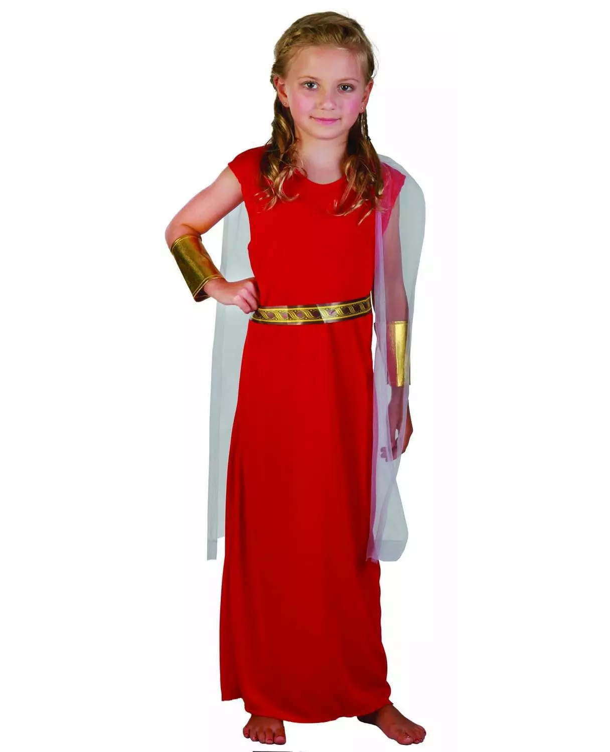 Med gulldetaljer! Dette romerske kostymet for jenter består av en kjole, et belte og et par mansjetter. Det ermeløse, røde antrekket har et hvitt tyllslør. Gullmansjetter med borrelås og et fint stoffbelte med borrelås vil også fullføre antrekket. En liten tyllstola festet til skulderen kan holdes i hånden. Dette settet vil være perfekt for karneval eller andre kostymearrangementer. Inkludert tilbehør: Kjolemansjetter Belte Materiale: 100 % polyester Vedlikehold: Håndvask