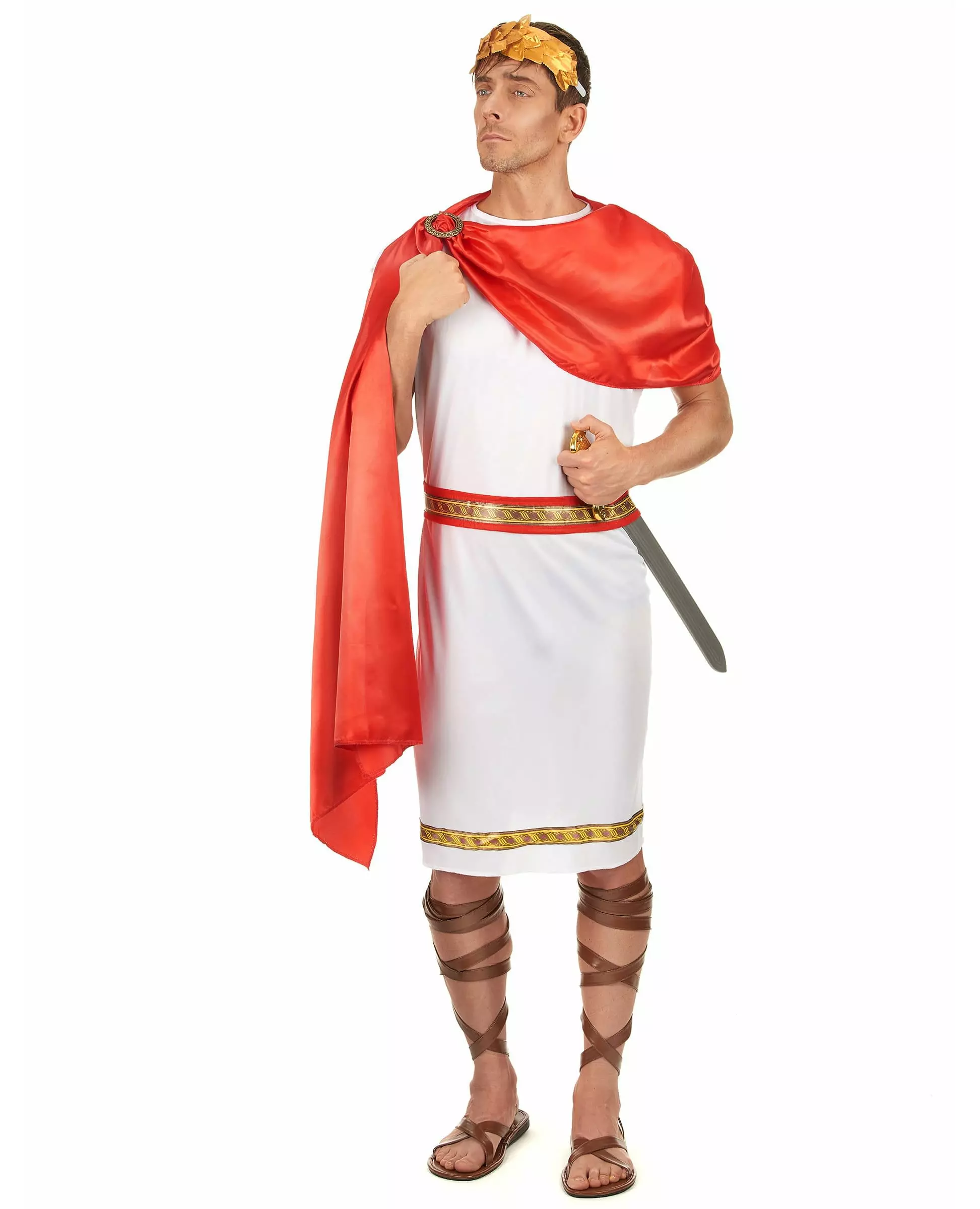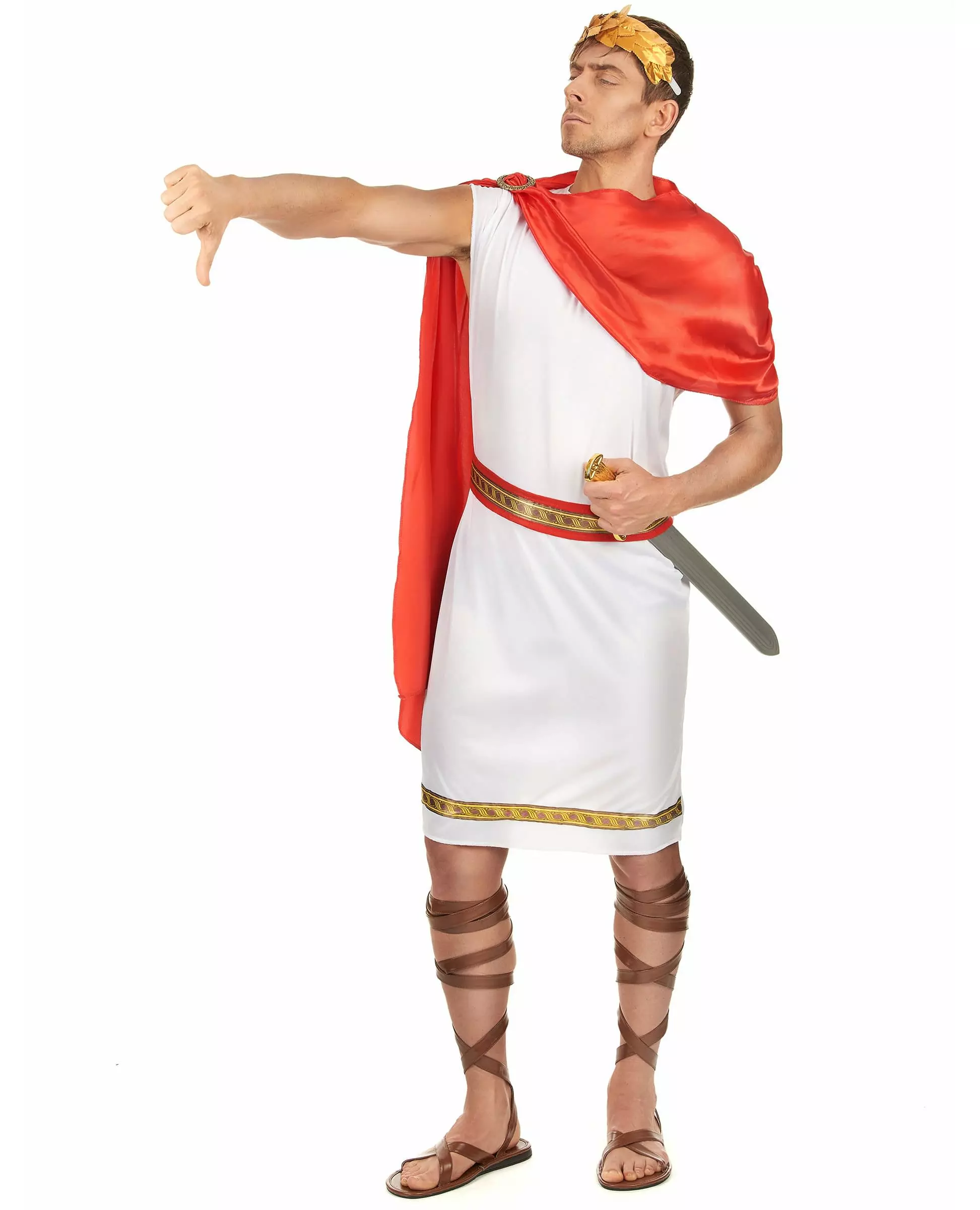 Bli en romersk keiser i dette kostymet. Dette romerske kostymet i pluss-størrelse er for menn. Det består av en toga med kappe, et belte og et hodeplagg (sandal og sverd er ikke inkludert). Den korte togaen er hvit. Den er utsmykket med en flette nederst. Beltet er rødt med en gullflette i midten. Den knytes enkelt bak. Satengkappen er rød. Den går rundt halsen og har en plastspenne for et elegant utseende. Hodeplagget forestiller en gyllen laurbærkrans. Dette kostymet i pluss-størrelse vil være perfekt for å delta på karneval eller en fest. Antikk tema. Tilbehør inkludert: Tunika med kappe Beltepannebånd Materiale: 100 % polyester Vedlikehold: Håndvask