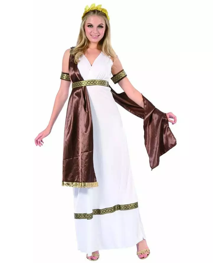Sexy Antikvitet Dette kostymet for voksne er en illustrasjon av et antikt antrekk. Det inkluderer en kjole med laken, et belte, armbånd og et hårbånd (sko ikke inkludert). Kjolen er hvit og laget av fint stoff. Den er lang, med svart og gullbroderi sydd nederst. Beltet, som bæres litt høyt, har samme mønstre. En satengbrun kappe er festet til skulderen, og en gullfarget plastspenne pryder brystet. De to polyesterarmbåndene har en brun base, og mønstre som ligner på beltet er sydd på toppen. De lukkes med borrelås. Det hvite plastpannebåndet er toppet med gullblader. Bruk dette damekostymet til en romersk eller gresk temafest. Inkludert tilbehør: Kjole med drapering Belte 2 armbånd Pannebånd Materiale: 100 % polyester Vedlikehold: Håndvask
