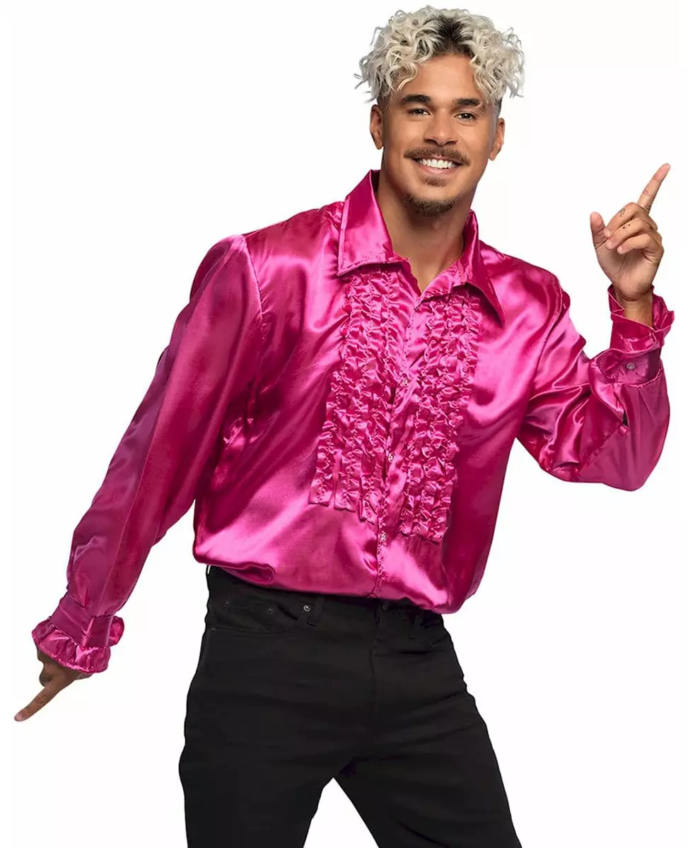 Satengeffekt! Dette discokostymet for menn består av en satengrosa skjorte med lett utsvingte ermer, knapper og volanger. Dette kostymet vil være ideelt for å sette fyr på scenen på en discofest!. Materiale: 100 % polyester Vedlikehold: Håndvask