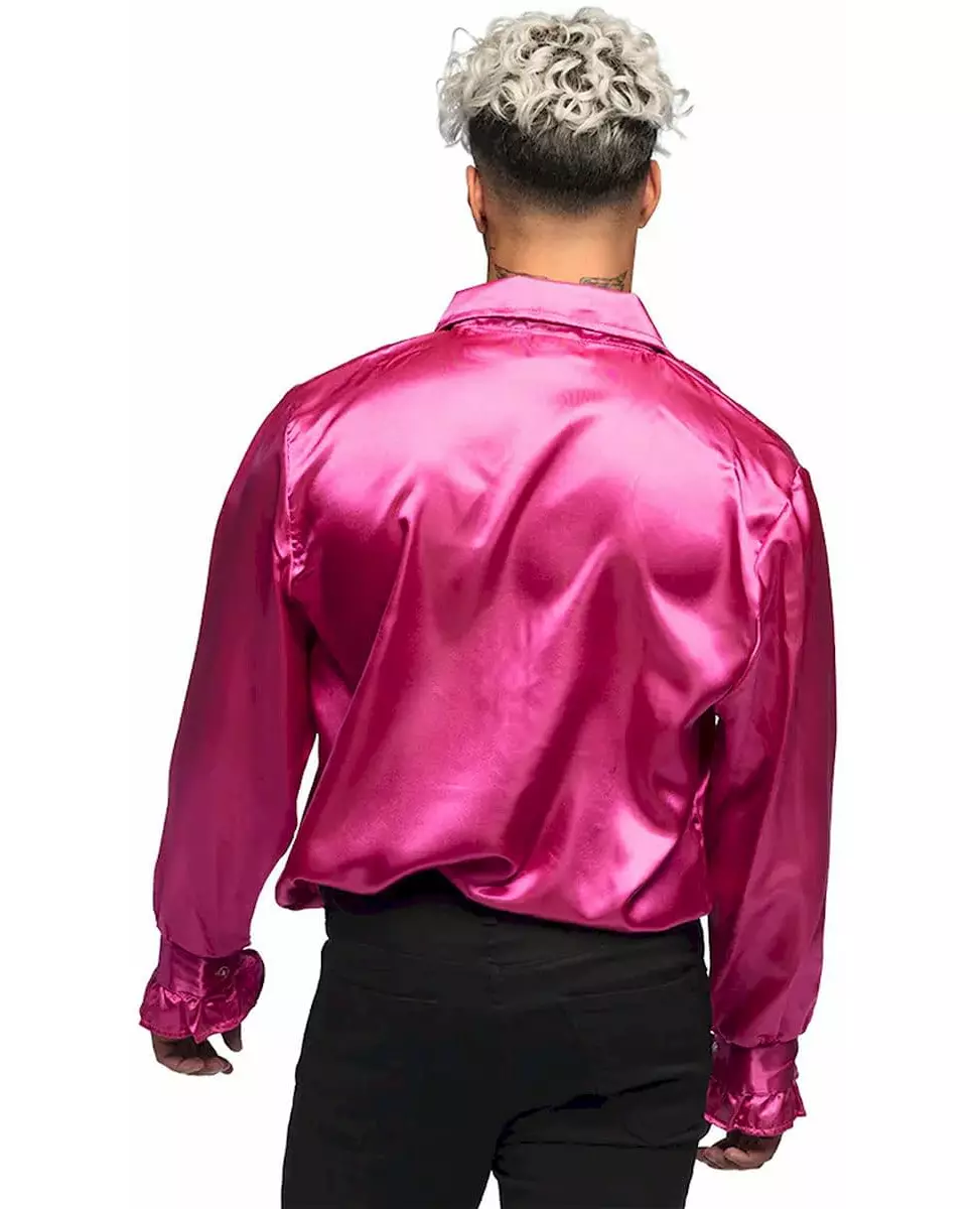 Satengeffekt! Dette discokostymet for menn består av en satengrosa skjorte med lett utsvingte ermer, knapper og volanger. Dette kostymet vil være ideelt for å sette fyr på scenen på en discofest!. Materiale: 100 % polyester Vedlikehold: Håndvask