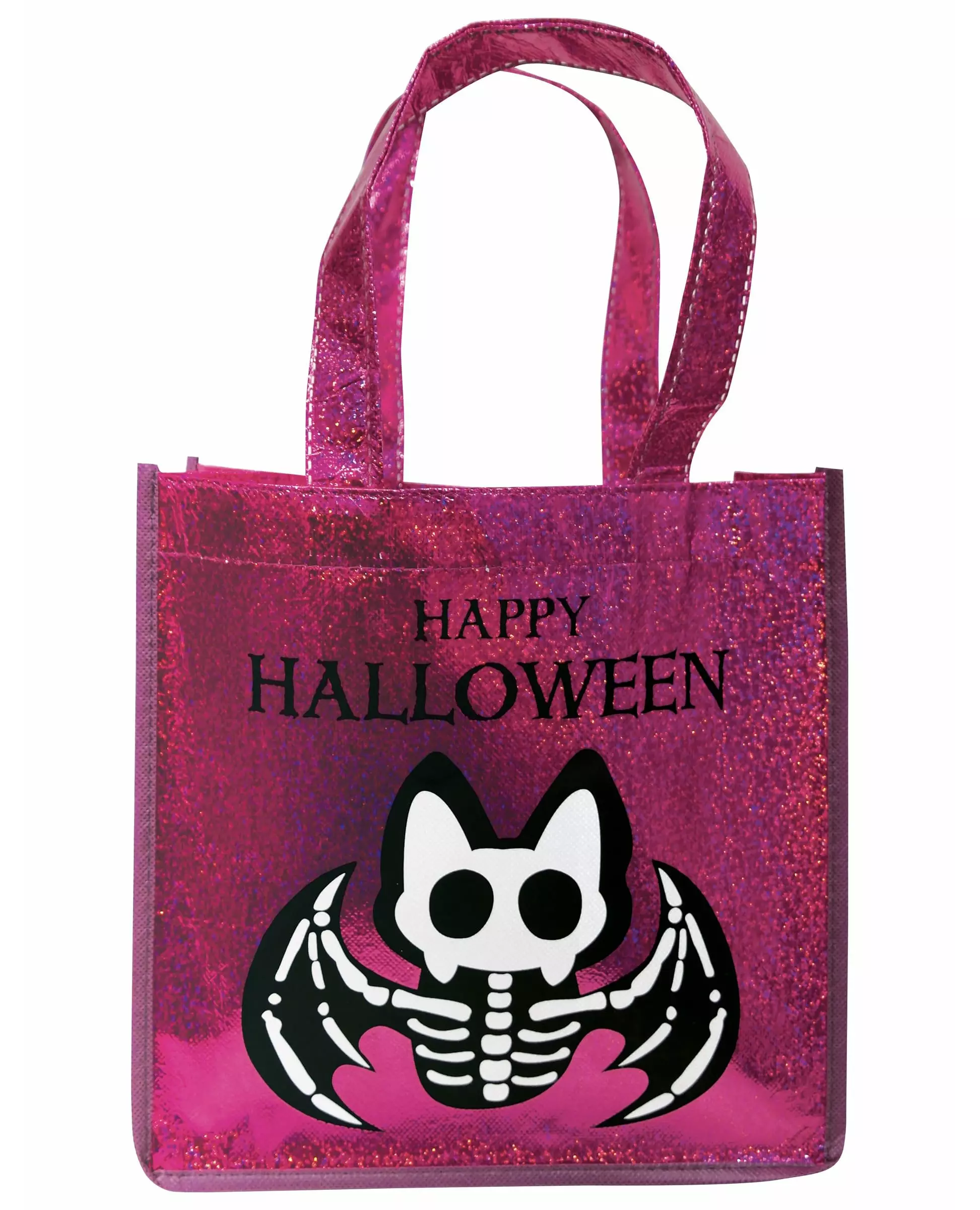 Samle så mange godbiter som mulig med denne rosa flaggermus-paljettposen! Denne rosa skjelett-flaggermus-paljettposen måler 24,5 x 8 x 24,5 cm. Posen er i rosa paljetter med brede håndtak, og et skjelett-flaggermusdesign er avbildet på posen. Ta med denne posen på din neste Halloween-triks eller knep og samle så mange godbiter som mulig. Inkludert tilbehør: Posemateriale: 100 % polyester Stell: Håndvask