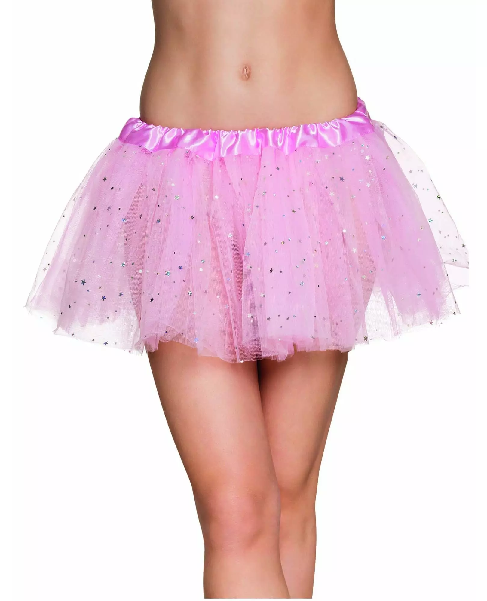 Glitrende tyll! Denne lyserosa tutuen for kvinner er laget av tyll. Små glitrende stjerner er preget av hele tutuen. Midjen er elastisk for å passe en rekke kroppsformer. Denne tutuen vil være perfekt for å fullføre et fargerikt og glitrende ballerinakostyme til en utkledningsfest eller karneval. Inkludert tilbehør: Tutu