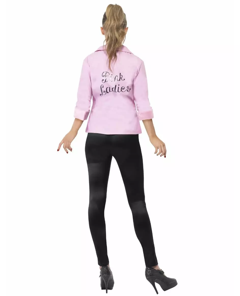 Rosa Grease™ Deluxe-jakke for kvinner Tilbake til 50-tallet Dette rosa damekostymet™ Deluxe er offisielt lisensiert fra filmen Grease™. Det har en jakke med tre stoffmerker. Voksenkostymet inkluderer: Jakke, tre stoffmerker.