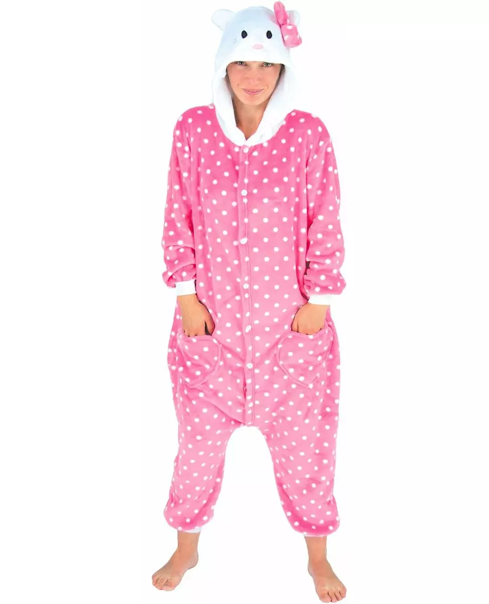 Et varmt og komfortabelt kostyme. Dette rosa kattekostymet for voksne inkluderer en jumpsuit med hette. Jumpsuiten er laget av rosa plysjstoff med hvite prikker. En hvit hette, dekorert med et kattehode, er sydd på jumpsuiten. Den lukkes foran med en knappelukking. Denne komfortable jumpsuiten vil sørge for at du holder deg varm og komfortabel på utkledningskveldene eller karnevalskveldene. Inkludert tilbehør: Jumpsuit med hette Materiale: 100 % polyester Vedlikehold: Håndvask Målinformasjon: Hello Kitty