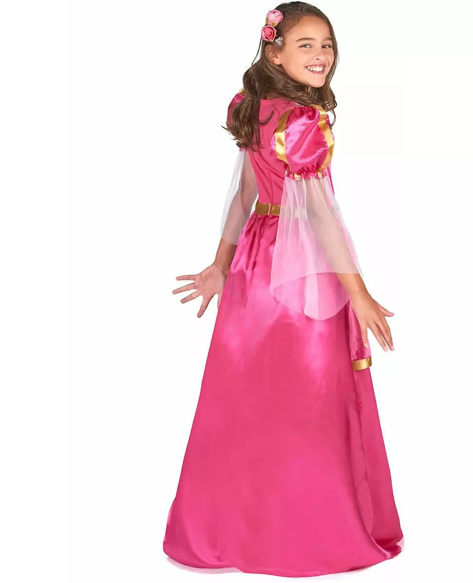 En ekte prinsesse! Dette prinsessekostymet for jenter består av en kjole. Kjolens topp er rosa med puffermer på skuldrene. Resten av ermene er laget av et gjennomsiktig hvitt slør. Kjolen er lang og går ned til føttene, den har en liten gullfarget overdel samt et gullbelte. Et hvitt bånd er plassert i midten av kjolen for en vakker imitasjon av en middelalderkjole. Dette prinsessekostymet vil være perfekt for en prinsessetema- eller middelaldertema-kostymefest! Inkludert tilbehør: Kjole Materiale: 100 % polyester Pleie: Håndvask