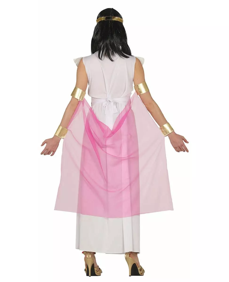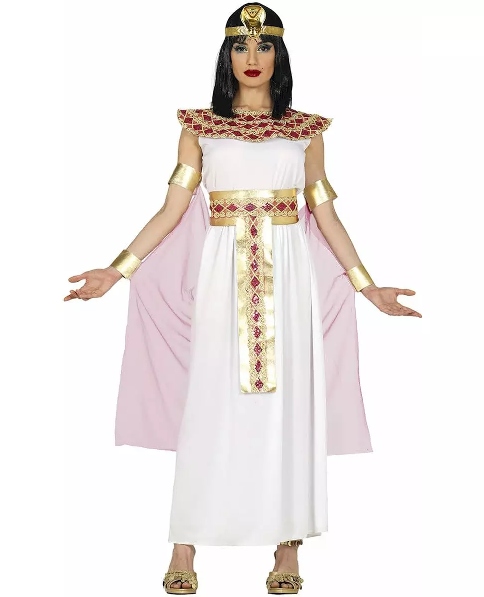 Gammel skjønnhet! Dette egyptiske kostymet består av en kjole, en kappe og et belte (parykk, krone og sko er ikke inkludert). Den lange hvite kjolen er dekorert med en bred halsring med rosa og gullmønstre. Midjen er fremhevet med et belte som matcher kragen. En rosa kappe som festes til armen med gullbånd fullfører antrekket. Med dette egyptiske dronningkostymet kan du gjenopplive faraoenes æra til en kostymefest med oldtidstema, eller til karneval. Inkludert tilbehør: Kjole, kappe, belte Materiale: 100 % polyester Vedlikehold: Håndvask
