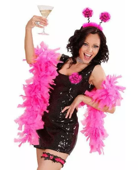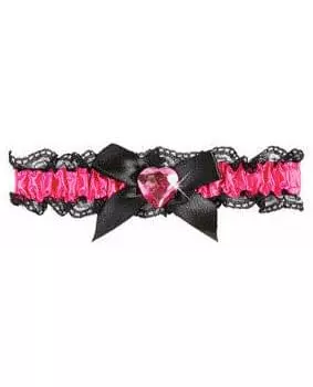 En sexy rosa og svart utdrikningslagsstrømpebånd. Denne satengstrømpebånden for kvinner er rosa og svart. Den er omgitt av blonder og utstyrt med en sjarmerende svart sløyfe med rosa diamant. Et essensielt tilbehør til alle utdrikningslag. Inkludert tilbehør: 1 strømpebånd Materiale: 100 % nylon