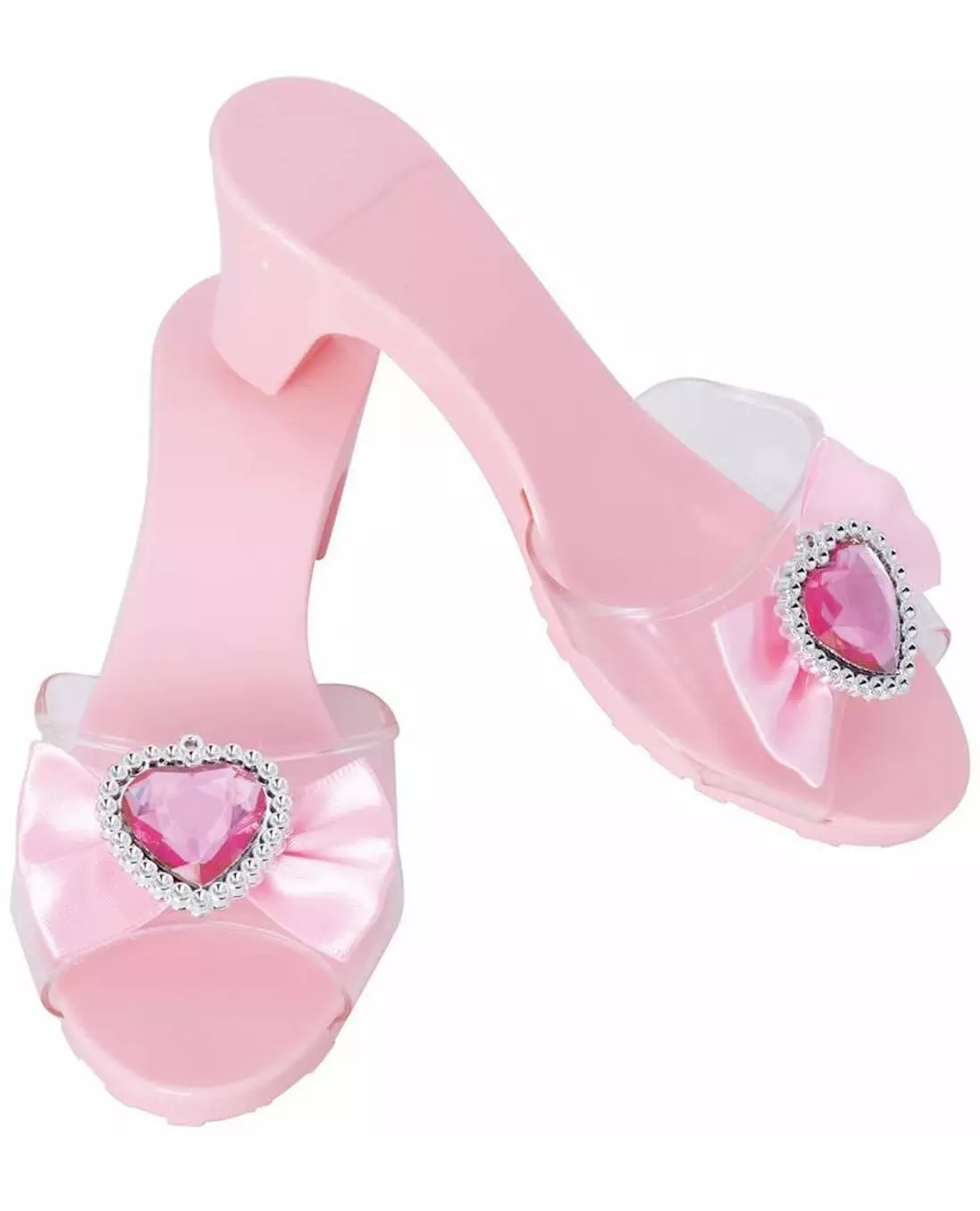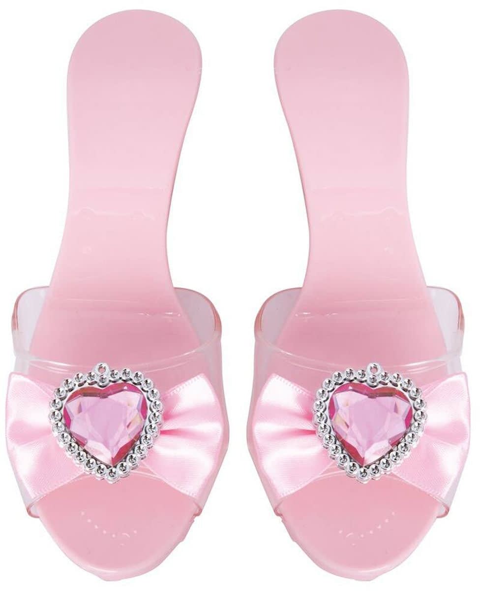 Gå som en dronning! Dette paret med rosa prinsessesko for barn er ideelle for å fullføre et kongelig antrekk. De er laget av rosa plast med en litt hevet hæl, og pyntet foran med en satengsløyfe dekorert med et glitrende hjerte, for et snev av glamour med hvert skritt. Perfekt til å følge et prinsessekostyme, disse skoene vil få barneøyne til å stråle på en bursdag, karneval eller kostymefest. Inkludert tilbehør: 1 par sko