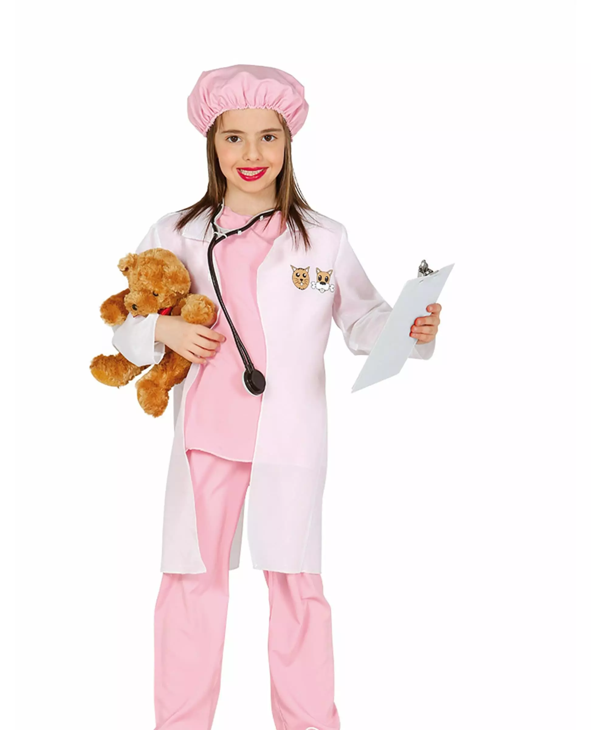 Et vakkert kall! Dette veterinærkostymet for jenter består av et hårnett, en topp og rosa bukser, samt en hvit bluse med hodet til en hund og en katt trykt på brystet (stetoskop, bamse og notatbok er ikke inkludert). Hvis barnet ditt drømmer om å redde dyr og ønsker å bli veterinær, vil dette antrekket gjøre dem glade på neste karneval. Inkludert tilbehør: Hatt, T-skjorte, bukser, bluse. Materiale: 100 % polyester. Vedlikehold: Håndvask.