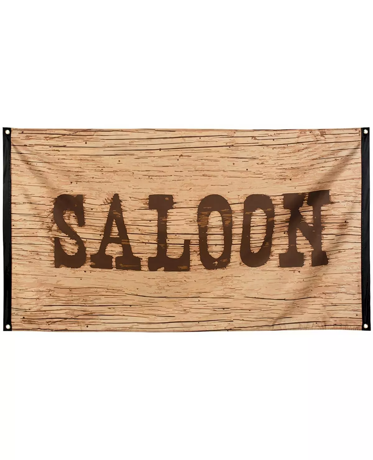 Forvandle rommet ditt til en Vill Vest-bar! Dette dekorative tilbehøret er et Saloon Western-flagg. Vill Vest-flagget måler omtrent 90 x 150 cm. Den brune «Saloon»-innskriften er plassert på en bakgrunn med treeffekt. Dette Saloon-flagget er perfekt for å dekorere et arrangement med western- eller cowboytema. Inkludert tilbehør: 1 flagg Materiale: 100 % polyester Vedlikehold: Håndvask
