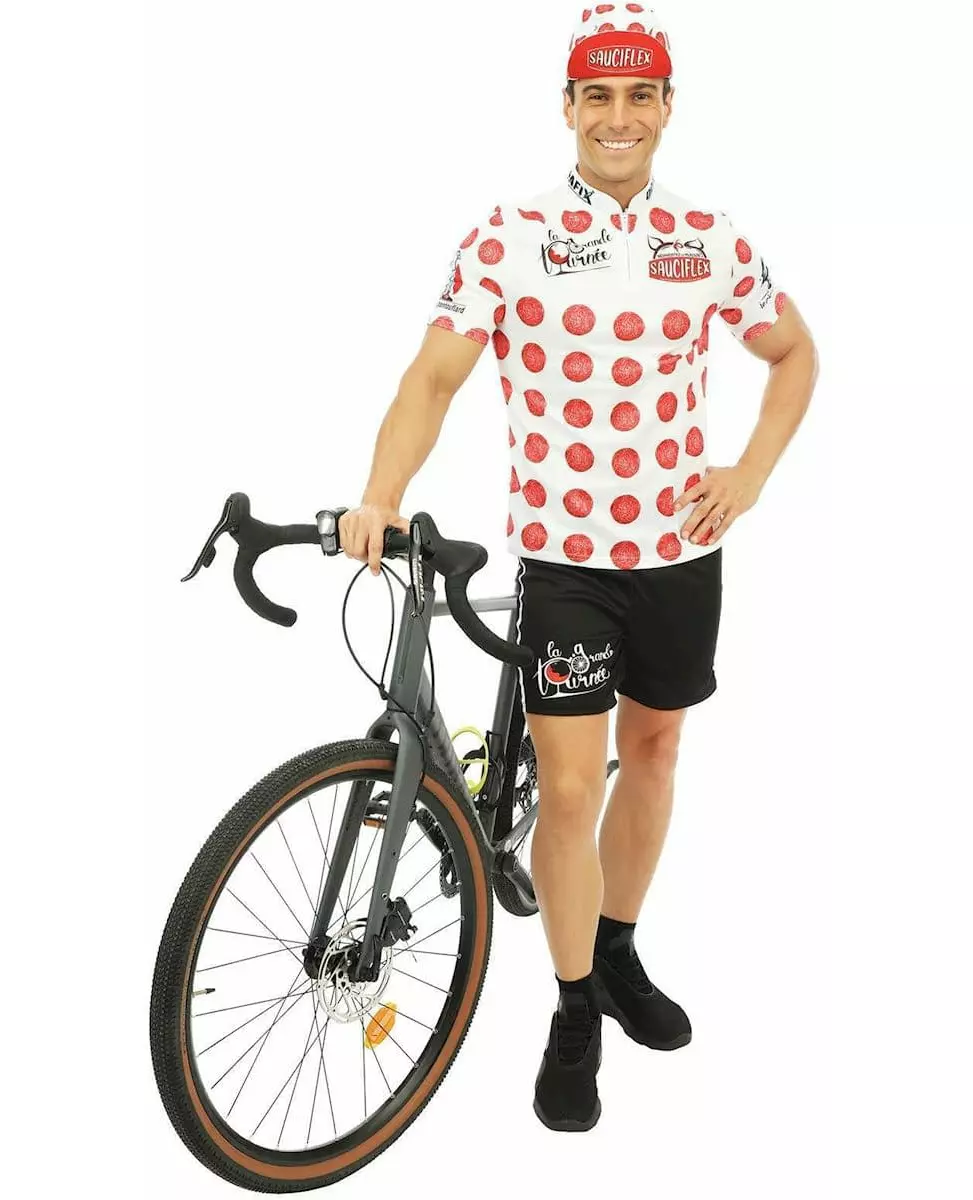 Sett deg på setet for Grand Départ! Dette sykkelkostymet for menn inkluderer en hvit trøye med røde prikker, svarte shorts og en matchende caps. Toppen imiterer den berømte klatretrøyen, med sine ikoniske røde prikker og falske sponsorlogoer, for et velfungerende humoristisk preg. De svarte shortsene står i effektiv kontrast til toppen, mens capsen fullfører antrekket i en avgjort sporty ånd. Perfekt for et kostymefest med sportstema, et utdrikningslag eller et karneval, lover dette kostymet å få hele feltet til å smile! Materiale: 2527. Inkludert tilbehør: 1 T-skjorte, 1 par shorts, 1 caps
