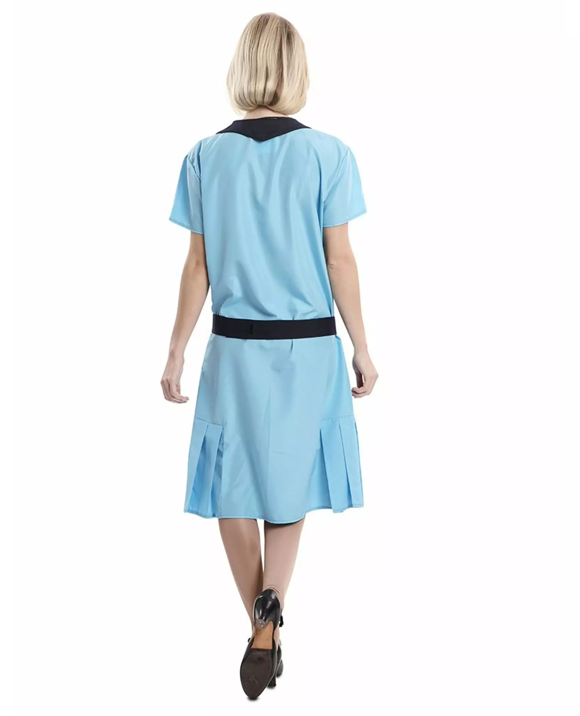 Bli en del av 50-tallsmoten Dette sekretærkostymet fra 50-tallet for kvinner består av en kjole og et belte (sko ikke inkludert). Den rette kjolen er blå med svart krage. Små svarte knapper er på bysten. Et belte er også inkludert. Det er svart med en firkantet spenne i midten. Dette retrokostymet vil være perfekt for å delta på en 50-tallsfest. Inkludert tilbehør: Kjole Belte Materiale: 100 % polyester Pleie: Håndvask