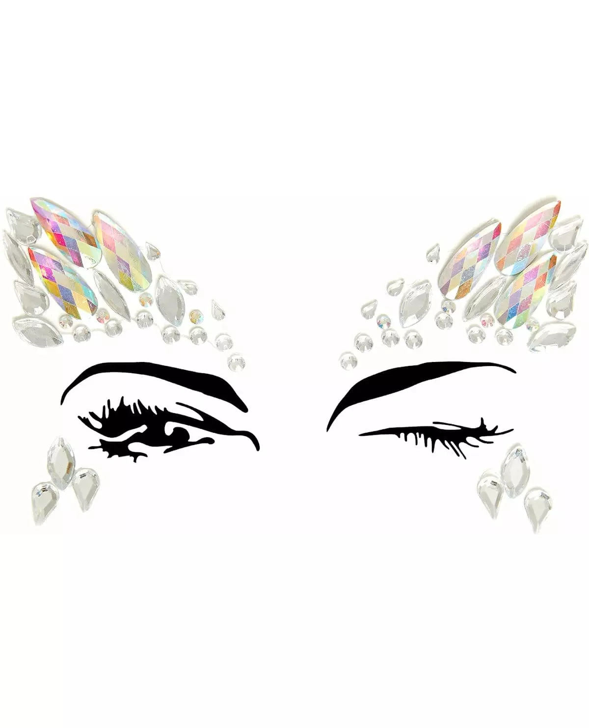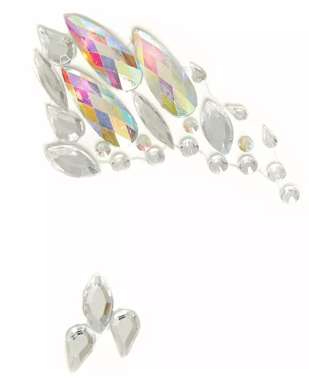 For et gudinneutseende! Disse himmelske ansiktsjuvelene ligner krystallskår, de er gjennomskinnelige med flerfargede refleksjoner. Rhinstenene er limende og presentert på et brett. Du må fjerne dem én etter én og deretter plassere dem på ansiktet ditt etter modellen. Med disse ansiktsjuvelene kan du legemliggjøre en himmelsk gudinne eller til og med isdronningen! La fantasien løpe løpsk og forbedre karnevalsminken din med disse rhinstenene! Tilbehør inkludert: 1 brett med rhinstener