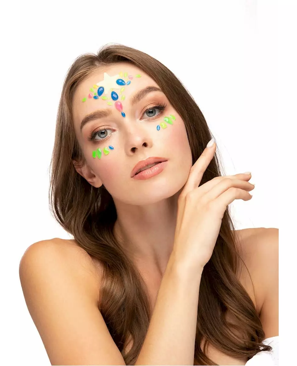 Rhinstener som lyser i mørket! Disse rhinstenene er til ansiktet. Settet inneholder flere fosforescerende rhinstener i forskjellige former og farger. Gi kostymet ditt et originalt preg med disse fosforescerende rhinstenene på nyttårsfesten eller på en festival! Ingredienser: 100 % akryl. Inkludert tilbehør: Rhinstener