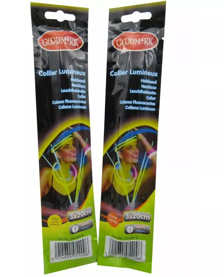 Lyser i mørket! Dette settet inkluderer et lysende halskjede og to koblinger. Bare bøy pinnene slik at de sender ut lys, og koble dem sammen med de medfølgende koblingene. Fargen på pinnene leveres tilfeldig. Når halskjedet er satt sammen, måler det omtrent 22 cm i diameter. Det vil være perfekt for kvelder ute på klubben eller på festival med venner. Inkludert tilbehør: 1 halskjede 2 koblinger Materiale: Plast