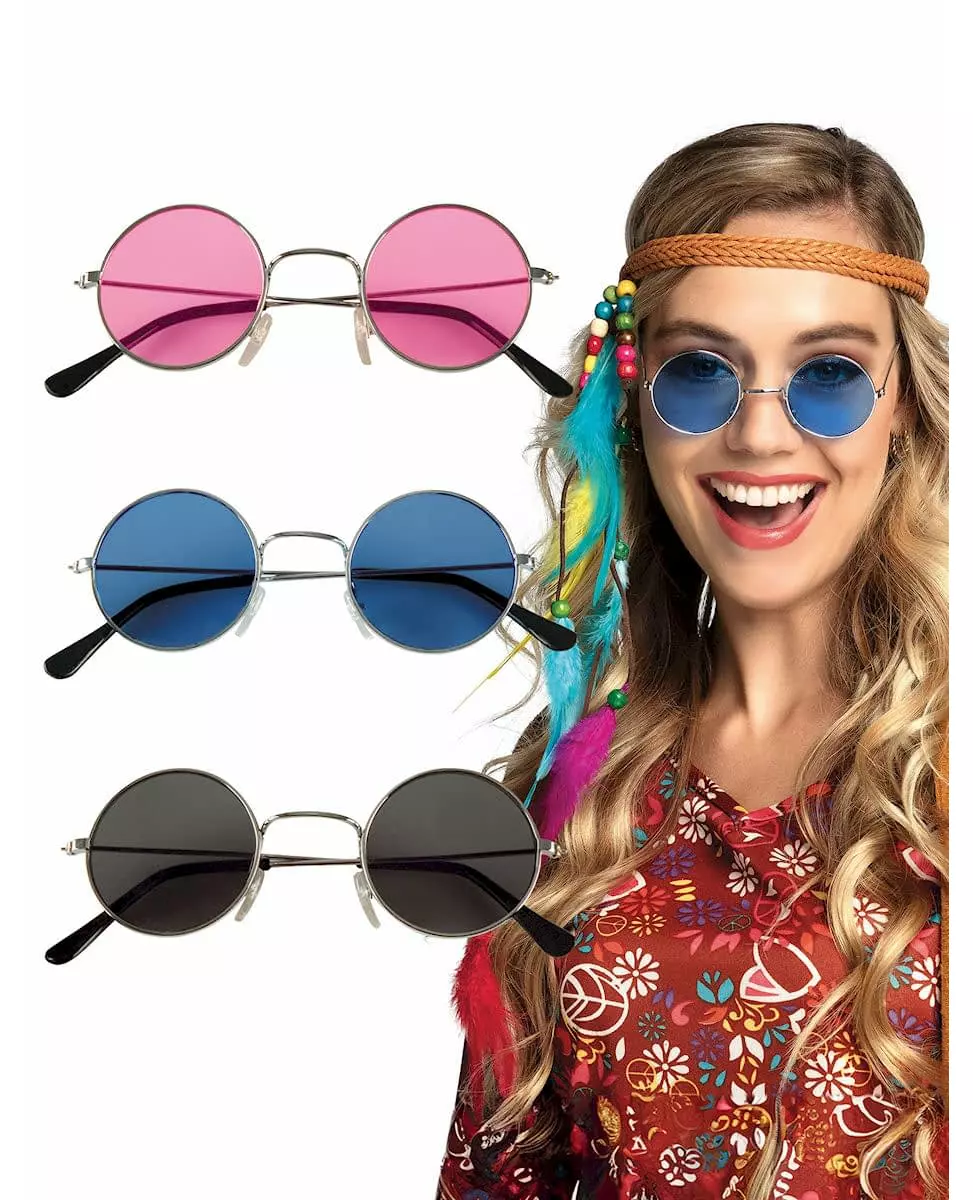 Hippieårene! Dette settet består av 3 par runde hippiebriller. Du finner 3 forskjellige farger: 1 par rosa, 1 par svarte og 1 par blå. Bytt briller etter humør med dette settet med 3 hippiebriller! Tilbehør inkludert: 3 briller