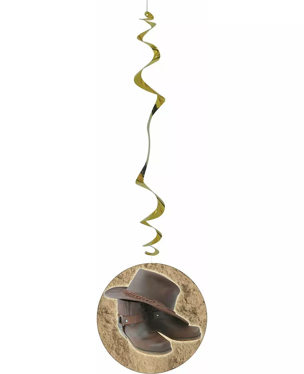 For en vellykket fest med cowboytema! Dette settet med 6 oppheng i western-stil er i metallisk gullfarge. Hver gyllen virvel avsluttes med en papirskive som måler omtrent 18 cm i diameter med støvler og en brun cowboyhatt trykt på begge sider. Disse opphengene vil være perfekte for en fest med cowboytema eller westerntema! Inkludert tilbehør: 6 oppheng. Materiale: Papir og plast.