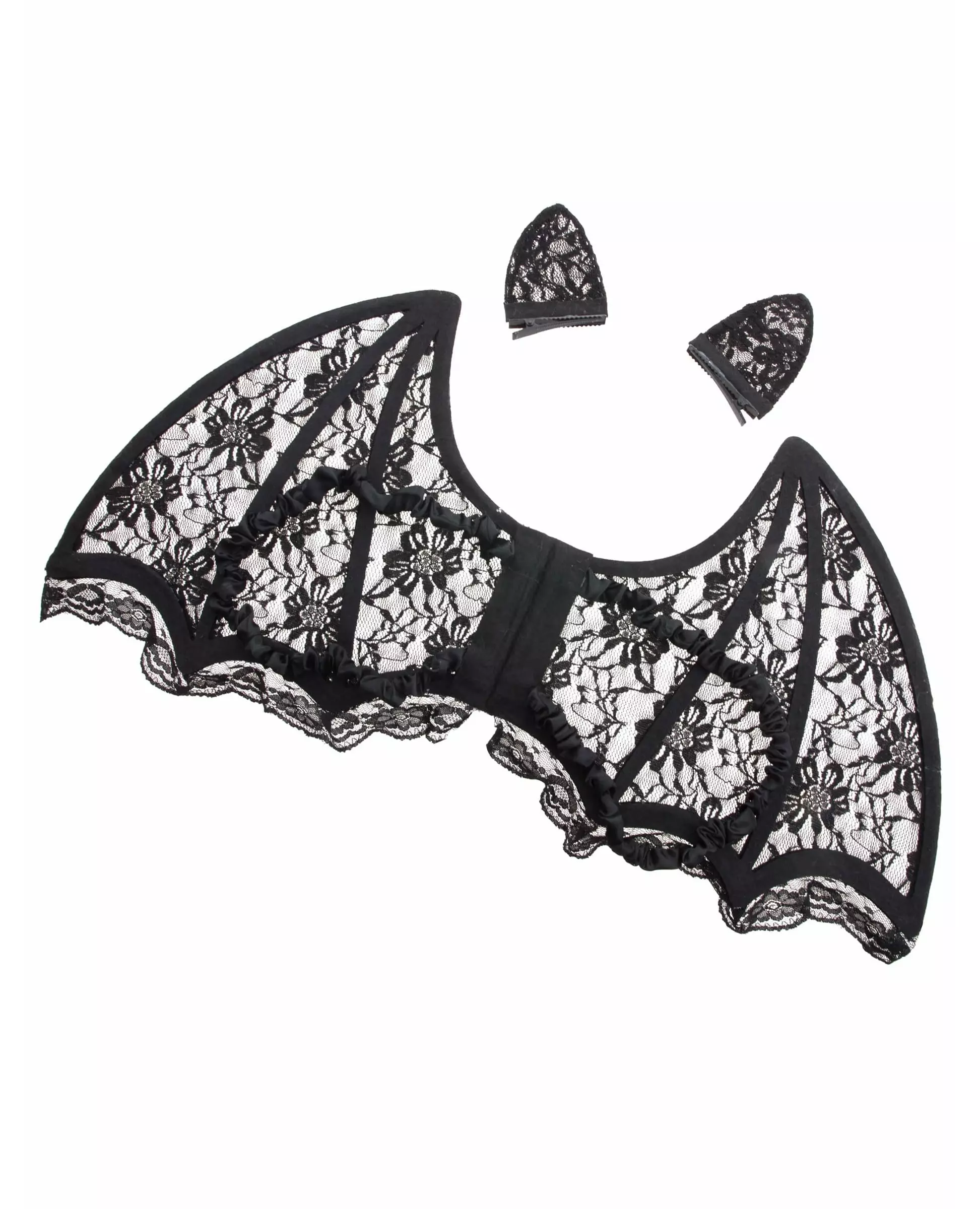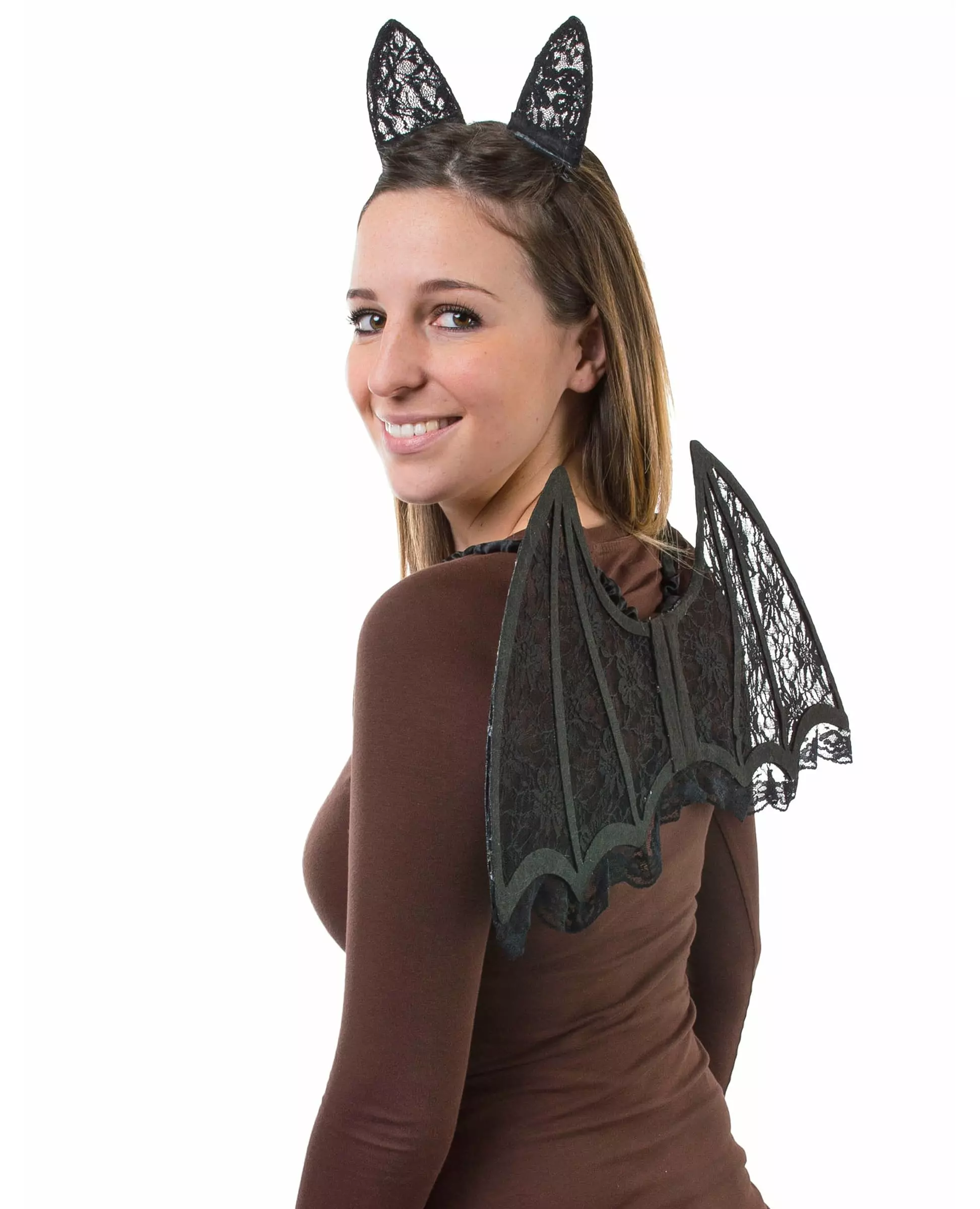 Det ultimate tilbehøret! Dette settet med svarte blondeflaggermusvinger og -ører er for voksne. Det består av flaggermusører med to hårspenner med klips og et par vinger som måler 50 x 30 cm. De svarte blondevingene ser ut som flaggermusvinger med svarte blomstermønstre innlemmet i vingene. Dette tilbehøret festes som en ryggsekk. Svarte ører legges til settet; de festes enkelt med små hårspenner med klips. Kle deg opp til en temafest eller Halloween-kveld! Inkludert tilbehør: 50 x 30 cm vinger, ører, 2 hårspenner med klips. Forsiktighet: Ikke vask.