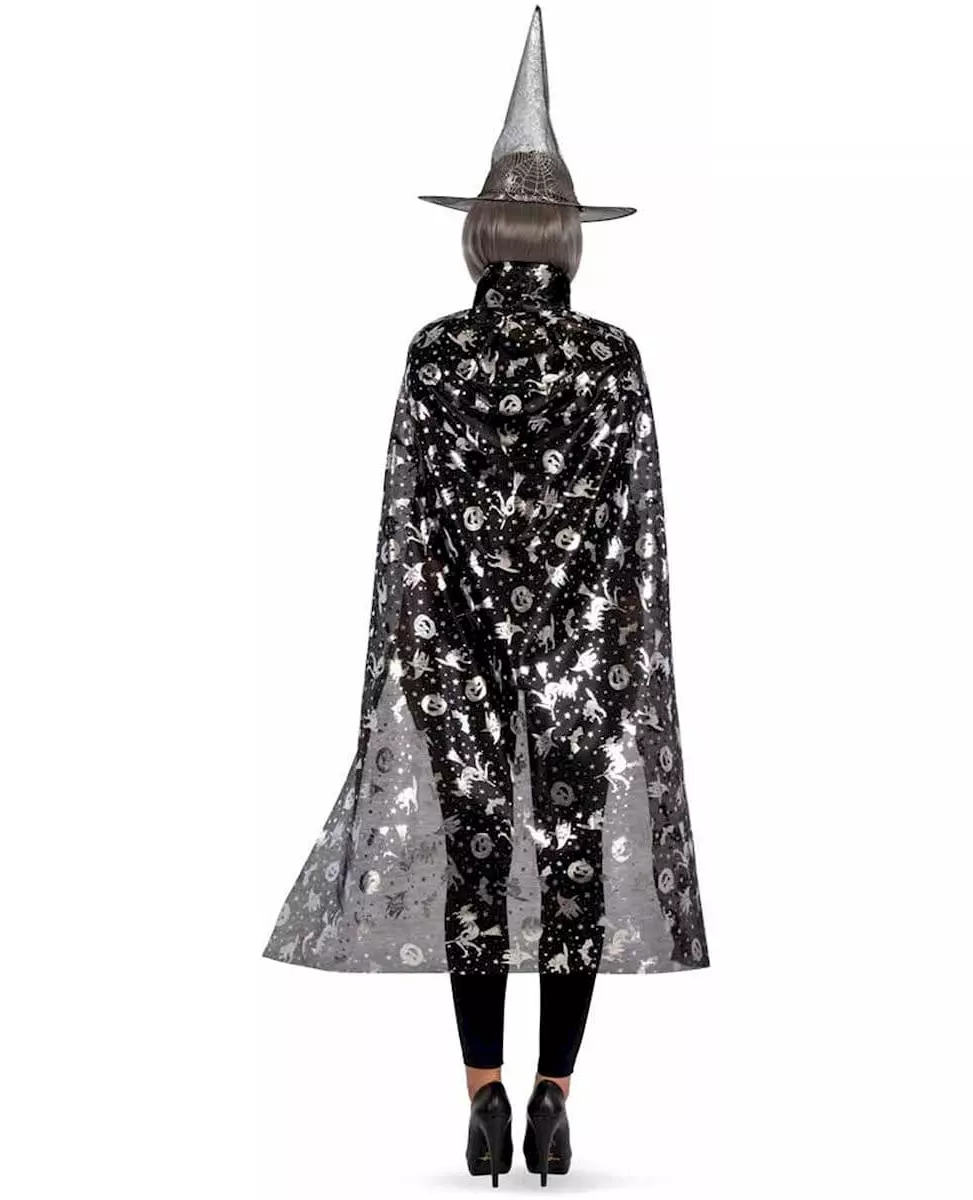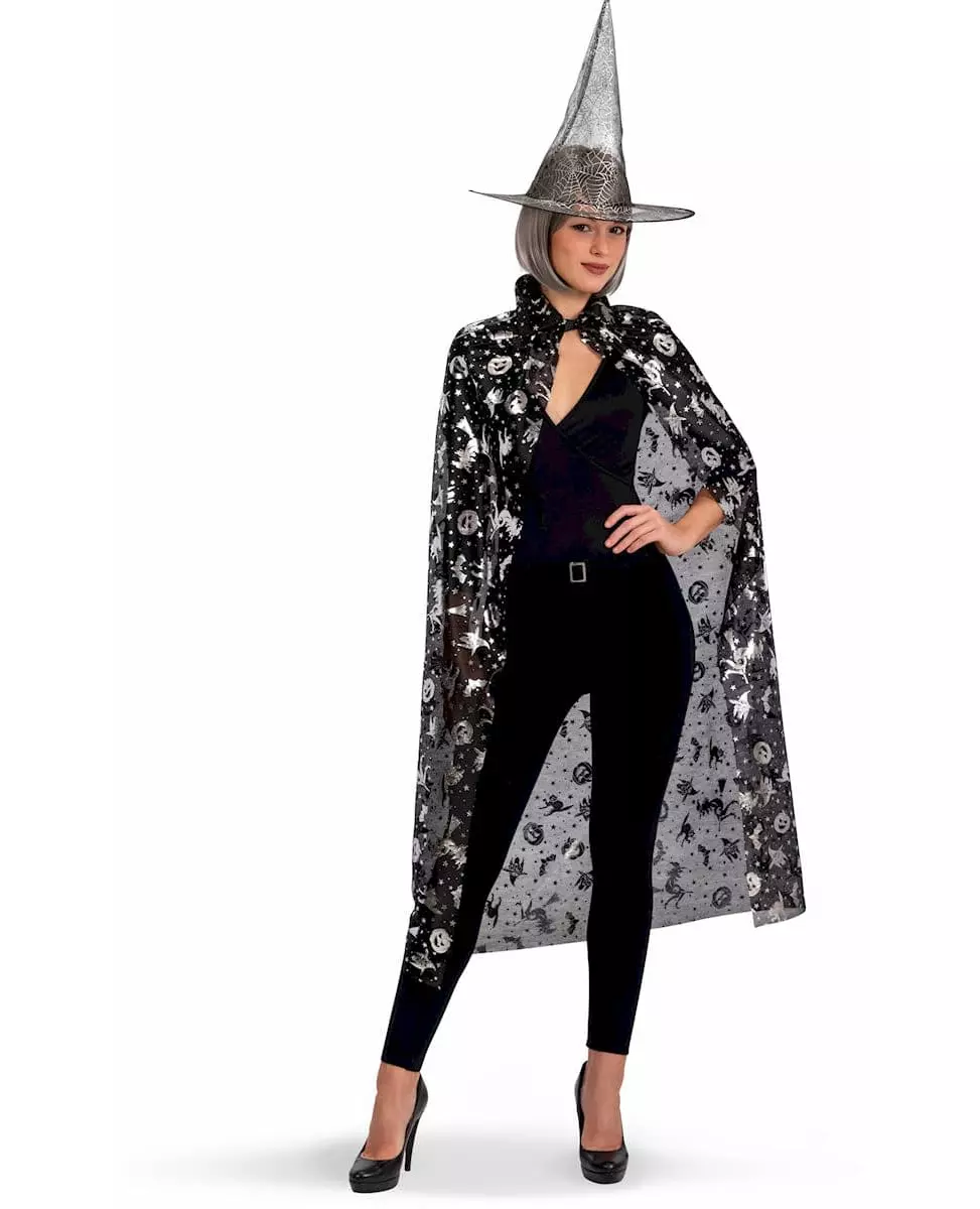 Sett med heksehatt og kappe i svart og sølv for kvinner