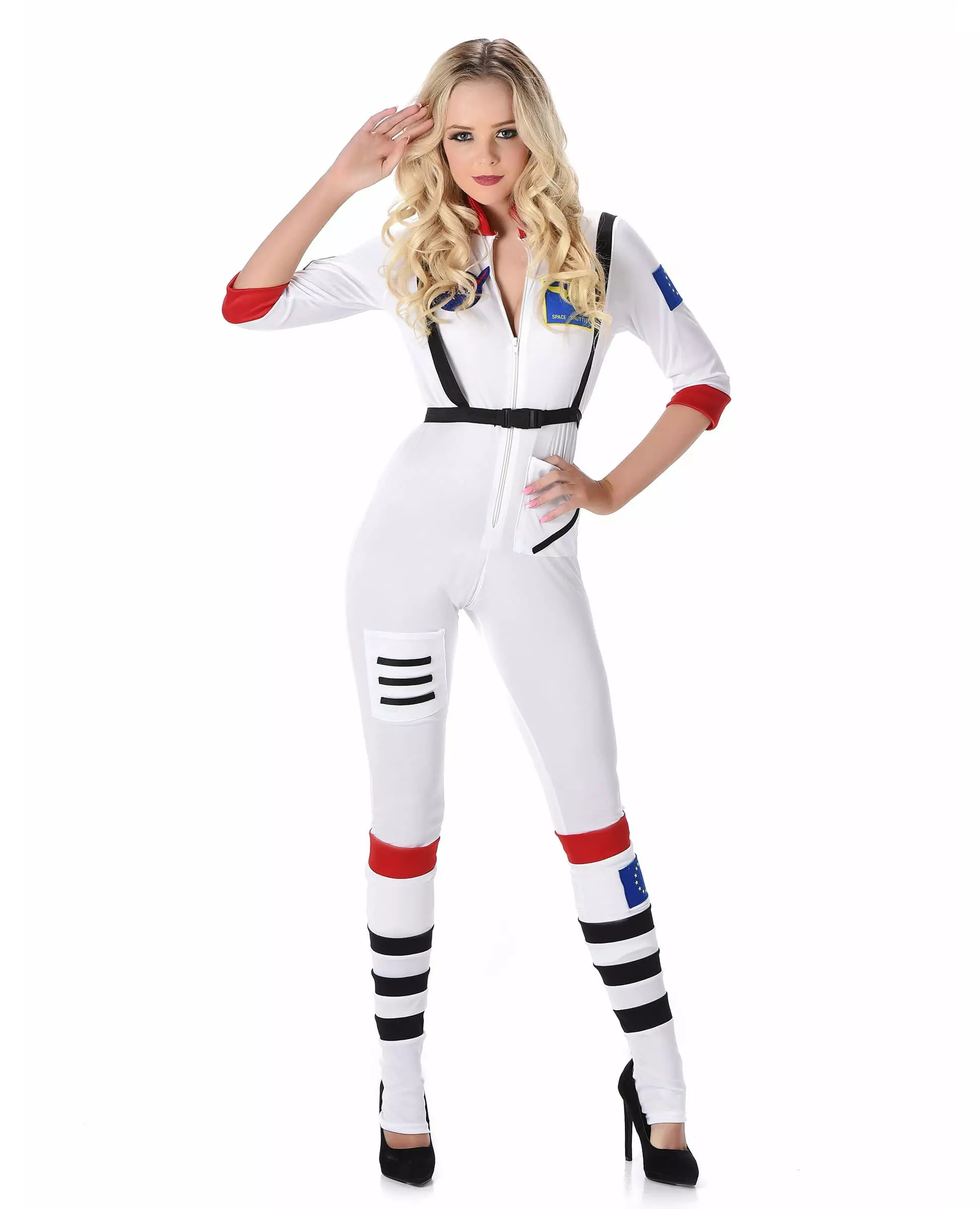 Fly forbi stjernene! Dette damekostymet består av en jumpsuit, et par leggvarmere og en sele (sko ikke inkludert). Den helhvite jumpsuiten er tettsittende og følger kroppens kurver perfekt. Den lukkes foran med en glidelås som lar deg justere dybden på halsutringningen. Lapper er brodert på brystet og venstre arm: de representerer akronymet til romfartsorganisasjonen "NASA" i blått, hvitt og rødt til høyre, og akronymet SPACE SHUTTLE i gult og blått til venstre. I tillegg passer den røde kragen perfekt til de blå merkene på armene. Til slutt er de inkluderte leggvarmerne høye og dekorert i rødt og svart, med det europeiske flagget. Fullfør astronaut-looken med den svarte selen, som vil gi antrekket et sexy utseende! En naturtro og svært forførende astronaut som skal fly ut i rommet for en utkledningsfest! Inkludert tilbehør: Jumpsuit Sele Par leggvarmere Materiale: 100 % polyester Vedlikehold: Håndvask Målinformasjon: For en størrelse S måler jumpsuiten omtrent 134 cm.