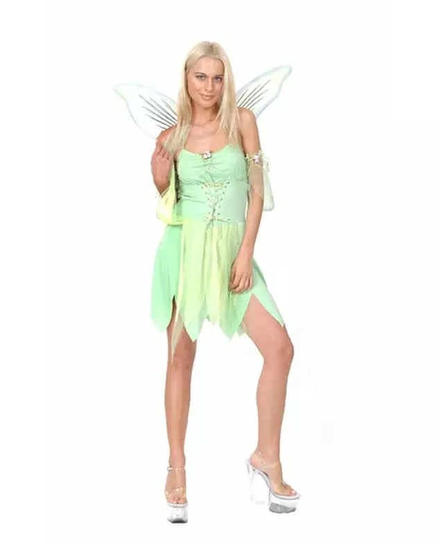 Inkluderer paljettbesatte vinger! Dette sexy fe-kostymet for kvinner består av en kort kjole, et par vinger og armbånd. Kjolen er ryggløs og festes rundt halsen. Det er en glidelås bak på kjolen. Plagget har et vakkert korsett som kan justeres med et gullbånd. Små stoffroser er festet til halsutringningen og armbåndene. Nederdelen av kjolen er dekket med et skinnende grønt slør. Vingene er også laget av samme slør med tillegg av fine paljettbesatte kanter. Vingene festes som en ryggsekk med hvite strikker. Dette kostymet er perfekt for å bli den mest sexy feen på kostymefester og til karneval. Inkludert tilbehør: Kjole Par vinger Armbånd Materiale: 100 % polyester Vedlikehold: Håndvask