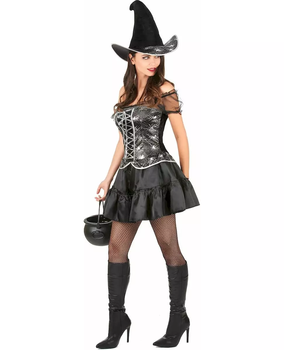 Sublim finish! Dette fantastiske Halloween-heksekostymet for kvinner består av en kjole. Kjolens byste er strammet foran med en ekte snøring som går fra topp til bunn. Det falske korsettet har et edderkopptrykk. Kostymet inkluderer også en perfekt matchende hatt (støvler og strømpebukser er ikke inkludert). Dette komplette kostymet vil gjøre deg til den mest glamorøse og sublime heksen på kostymefester eller Halloween. Inkludert tilbehør: Dresshatt Materiale: 100 % polyester Pleie: Håndvask