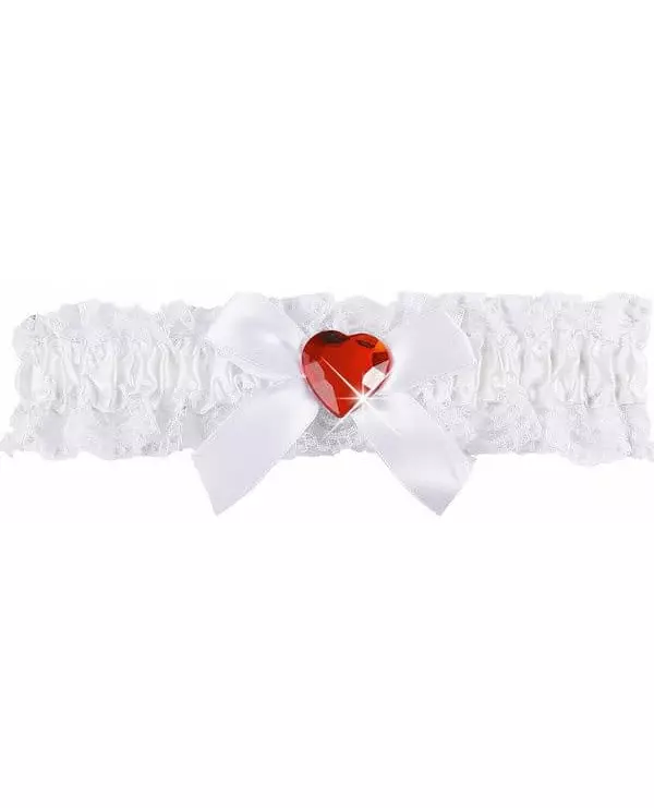 Vær sexy med dette hvite strømpebåndet! Dette sexy strømpebåndet for kvinner er hvitt. Det er laget av satengstoff, omgitt av hvit blonde. En hvit satengsløyfe med et oransjerødt plasthjerte pryder dette strømpebåndet. For ekstra komfort er dette strømpebåndet elastisk. Dette tilbehøret vil være perfekt for å fullføre et sexy antrekk til Valentinsdagen. «Copyright Widmann SRL». «Copyright Widmann SRL. Inkludert tilbehør: 1 strømpebånd