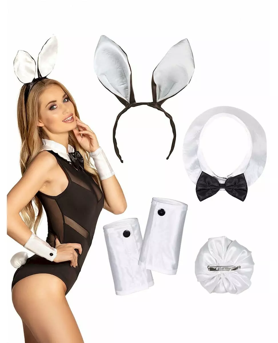 Bli den mest sexy kaninen til Valentinsdagen. Dette kaninsettet for kvinner består av et pannebånd, en krage, et par mansjetter og en hale. Satengpannebåndet er svart og hvitt. Det har lange kaninører. Den runde kragen har en svart sløyfe foran. Det lukkes med borrelås foran. De hvite mansjettene er sateng. De har en liten svart knapp nederst. Disse lukkes med en stripe borrelås. Den lille halen danner en hvit ball. Den festes til klærne dine med en nål. Dette settet vil være perfekt for å fullføre et sexy kaninkostyme til Valentinsdagen, for eksempel. Inkludert tilbehør: Pannebånd, krage, 2 mansjetter, hale