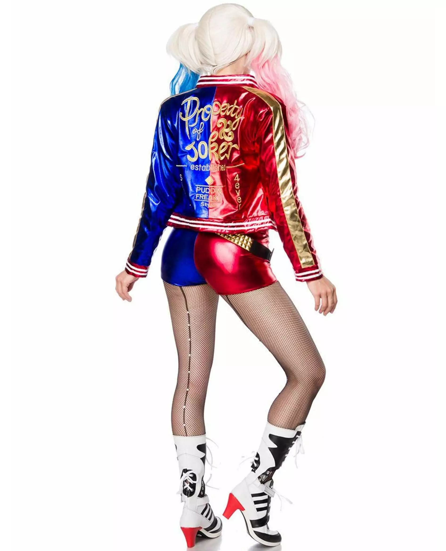 Bli med Jokeren i galskapen hans med dette vanvittige harlekinkostymet. Dette sexy harlekinkostymet for kvinner består av en jakke, en topp, shorts, et belte og et par strømpebukser (parykk og sko er ikke inkludert). Jakken er tofarget. Den har en blå side og en rød side. Den lukkes med glidelås. Den langermede toppen har hull for en slitt effekt. Den er rød og hvit. Minishortsen matcher jakken og er også tofarget. Den er komplett med et svart belte med imiterte gullnagler. Til slutt setter svarte fiskenettstrømpebukser prikken over i-en til dette kostymet. Dette sexy harlekinkostymet vil være perfekt for en superskurk-temafest eller til Halloween. Inkludert tilbehør: Jakke Topp Shorts Belte Strømpebukser Materiale: jakke/shorts: 94 % polyester, 6 % elastan, topp: 100 % polyester Vedlikehold: Håndvask