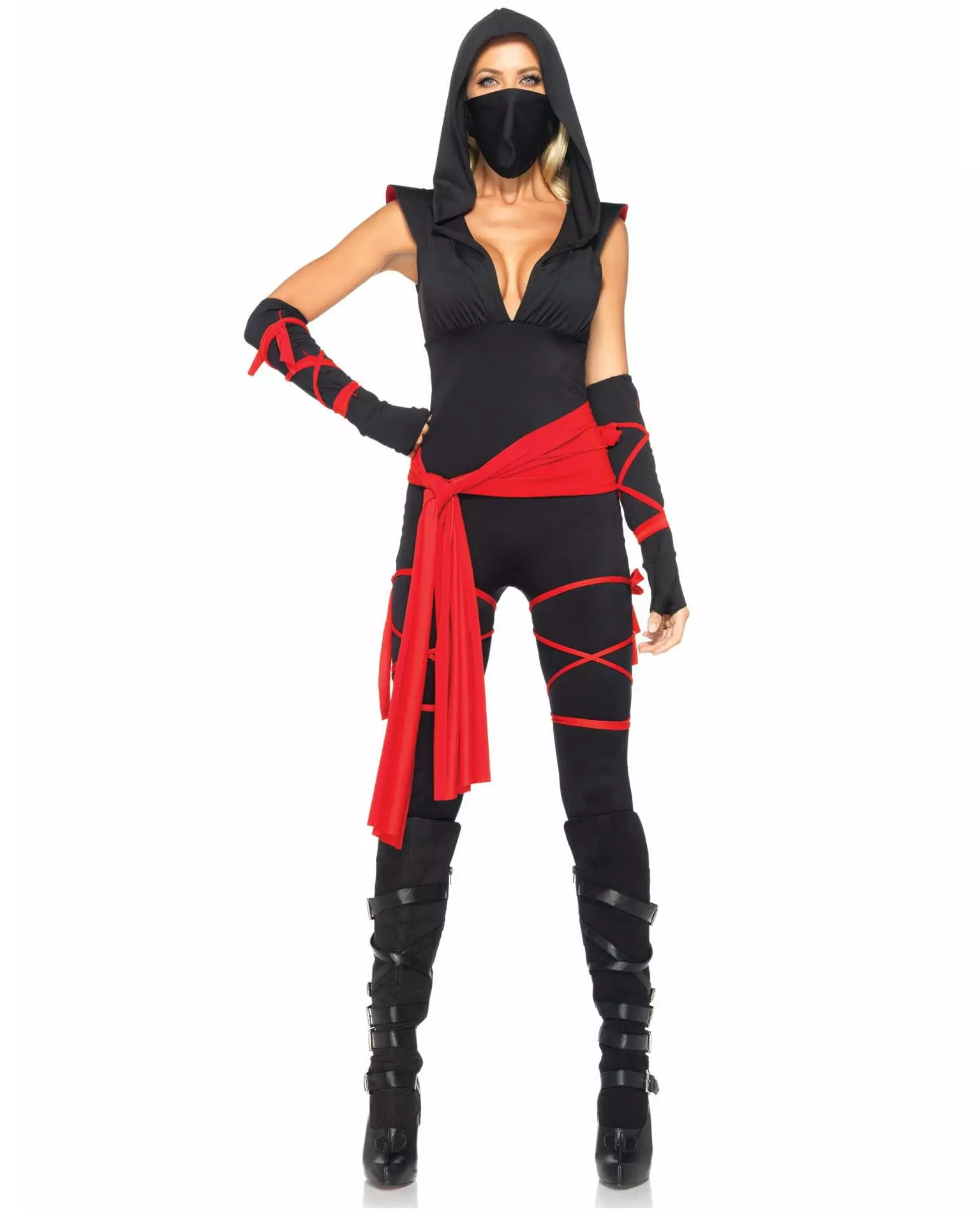 Legemliggjør en ekte spionkriger! Dette ninjakostymet for kvinner består av en jumpsuit, et belte, mansjetter og en maske. Jumpsuiten er svart og laget av elastisk stoff. En hette, en V-hals og små ermer fôret med rødt stoff gir en sexy effekt på toppen av denne jumpsuiten. Røde bånd er sydd nederst og knytes rundt lårene. Beltet er laget av rødt stoff. Den måler omtrent 20 cm høy og 1 m lang. Mansjettene er svarte med sydde røde bånd som knytes rundt underarmene. Den svarte masken festes bak hodet med to strikker. Dette komplette ninjakostymet vil være perfekt for en utkledningsfest. Inkludert tilbehør: Jumpsuit Belte 2 Mansjetter Maske Materiale: 100 % polyester Vedlikehold: Håndvask