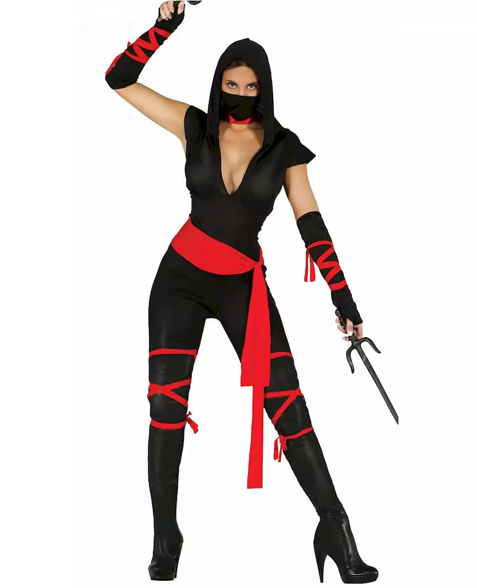 Vekk krigeren i deg! Dette ninja-kostymet for kvinner består av en hettegenser med bånd, en maske, et par votter og et belte (sko og våpen er ikke inkludert). Denne tettsittende jumpsuiten har korte ermer og en pen dyp utringning som vil gi antrekket et sexy preg. Ved knærne finner du rød snøring. En maske som dekker den nedre delen av ansiktet, samt et belte som kan knytes rundt livet, er også tilstede. Vottene er svarte og er også dekorert med rød snøring. Det perfekte kostymet for å legemliggjøre en sexy ninja på en spesiell begivenhet!. Inkludert tilbehør: Jumpsuit Votter Belte Maske Materiale: Polyester Stell: Håndvask
