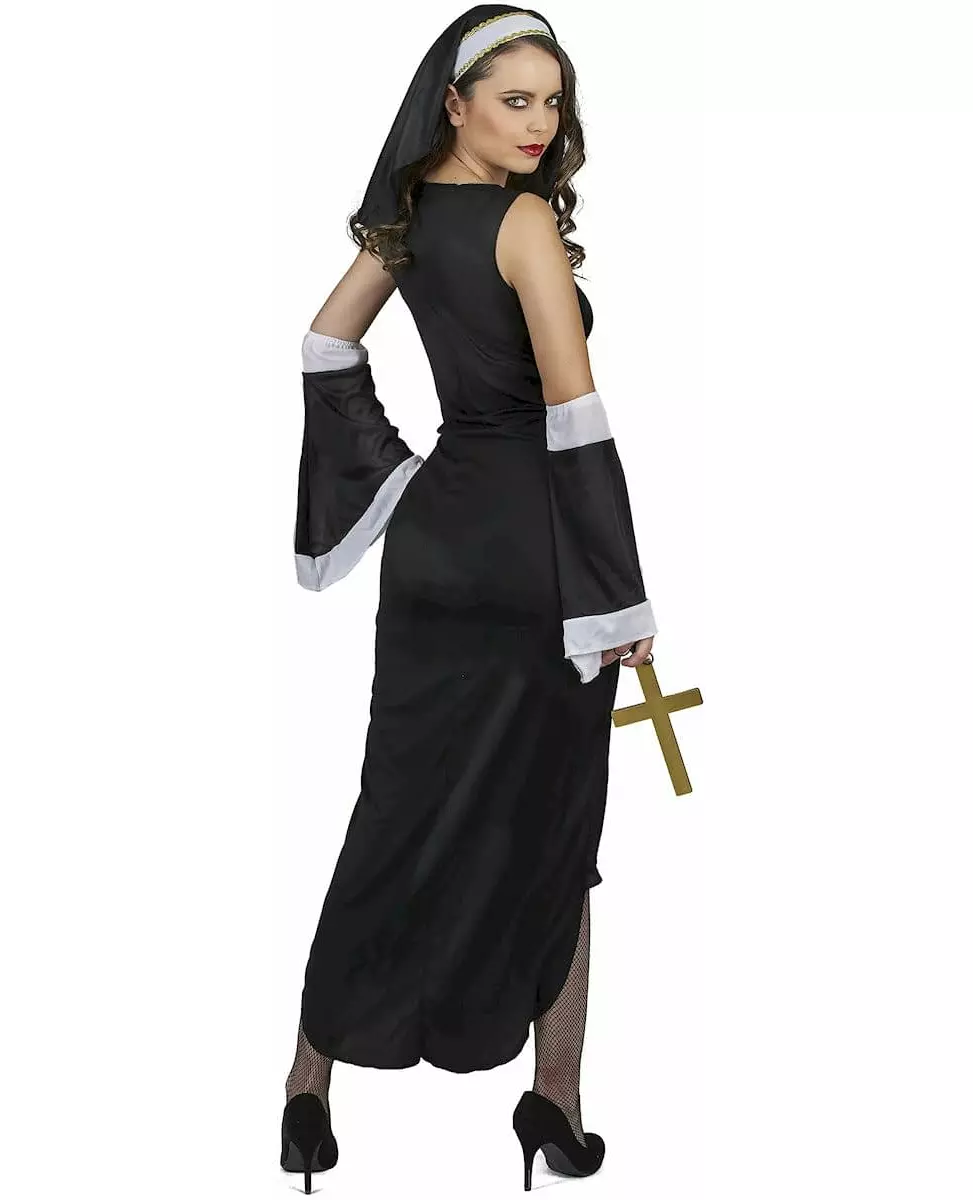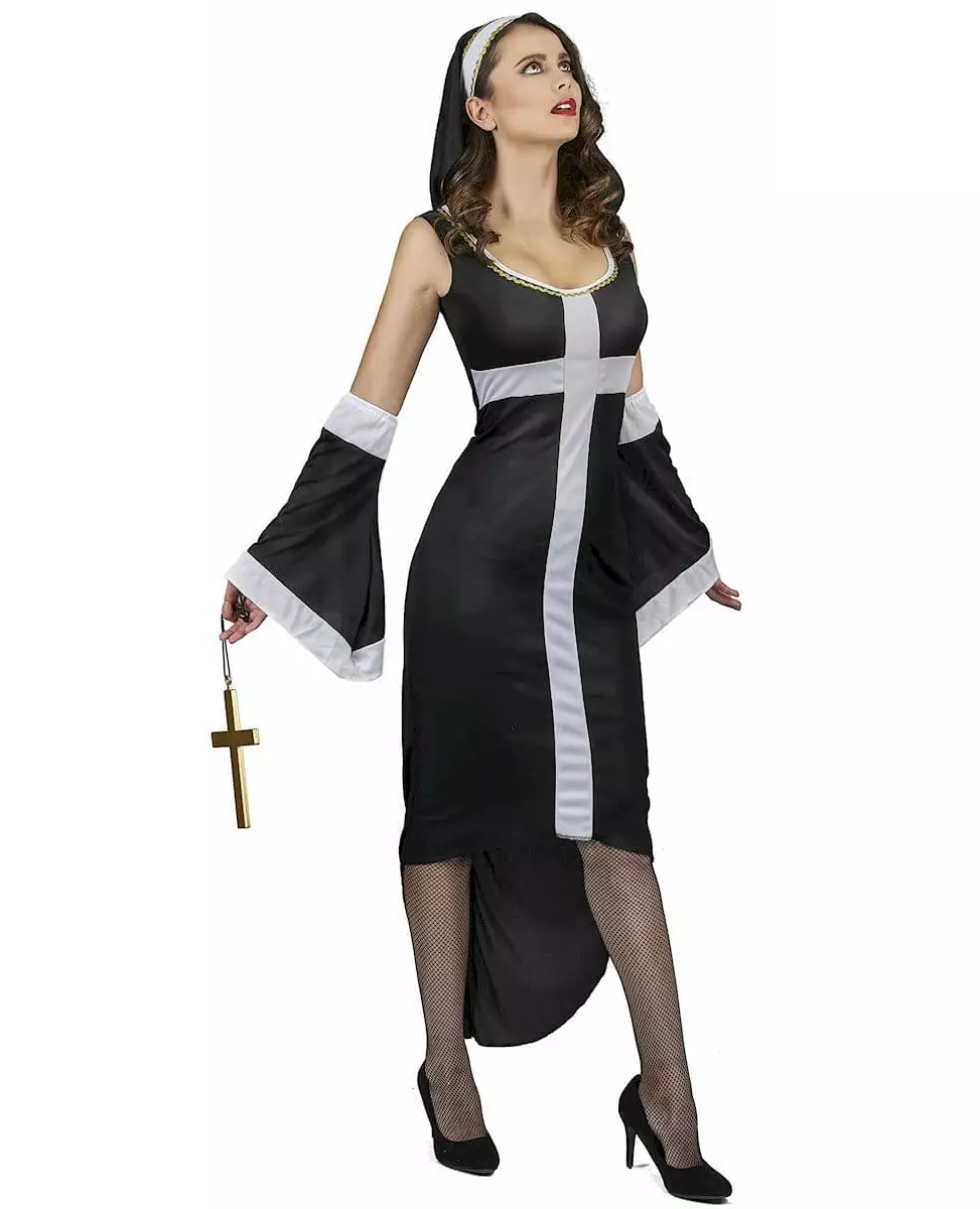 From og sexy! Dette nonnekostymet for kvinner inkluderer en kjole, to mansjetter og et hodeplagg (kors, strømpebukser og sko er ikke inkludert). Den svarte kjolen, lengre bak enn foran, har et stort hvitt kors langs hele antrekkets lengde. Halsutringningen er kantet med gull. Mansjettene er utsvingte og holdes på armene med strikker. Hodeplagget vil dekke deler av eller alt håret ditt, slik du ønsker. Dette nonneantrekket vil være perfekt for et utdrikningslag eller karneval! Inkludert tilbehør: Kjole Hodeplagg 2 mansjetter Materiale: 100 % polyester Vedlikehold: Håndvaskbar