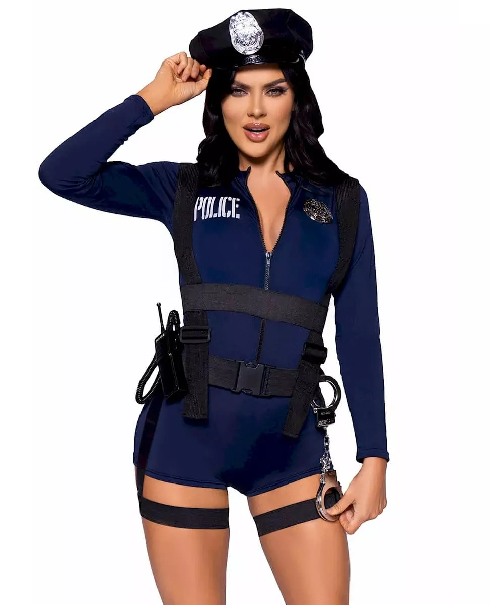 Hendene opp! Dette politikvinnekostymet er for kvinner og består av en drakt, en kroppssele, en falsk walkie-talkie, et merke, et par håndjern og en hatt. Drakten er blå og har ordene «Politi» skrevet på høyre side. Den har glidelås for enkel påkledning og svarte stropper for å feste tilbehør. Hatten er en mørk caps dekorert med et sølvfarget politimerke. Drakten er komplett med et sølvfarget merke samt en falsk walkie-talkie og et par håndjern. Dette politikvinnekostymet vil være perfekt til nyttår eller Valentinsdagen!. Inkludert tilbehør: Draktmerke, falsk walkie-talkie, håndjern, hatt, kroppssele. Materiale: 100 % polyester.