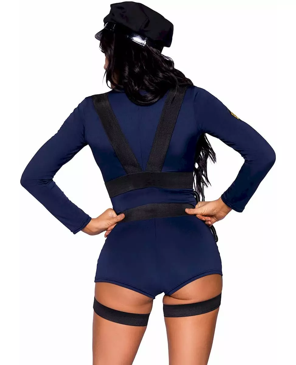 Hendene opp! Dette politikvinnekostymet er for kvinner og består av en drakt, en kroppssele, en falsk walkie-talkie, et merke, et par håndjern og en hatt. Drakten er blå og har ordene «Politi» skrevet på høyre side. Den har glidelås for enkel påkledning og svarte stropper for å feste tilbehør. Hatten er en mørk caps dekorert med et sølvfarget politimerke. Drakten er komplett med et sølvfarget merke samt en falsk walkie-talkie og et par håndjern. Dette politikvinnekostymet vil være perfekt til nyttår eller Valentinsdagen!. Inkludert tilbehør: Draktmerke, falsk walkie-talkie, håndjern, hatt, kroppssele. Materiale: 100 % polyester.