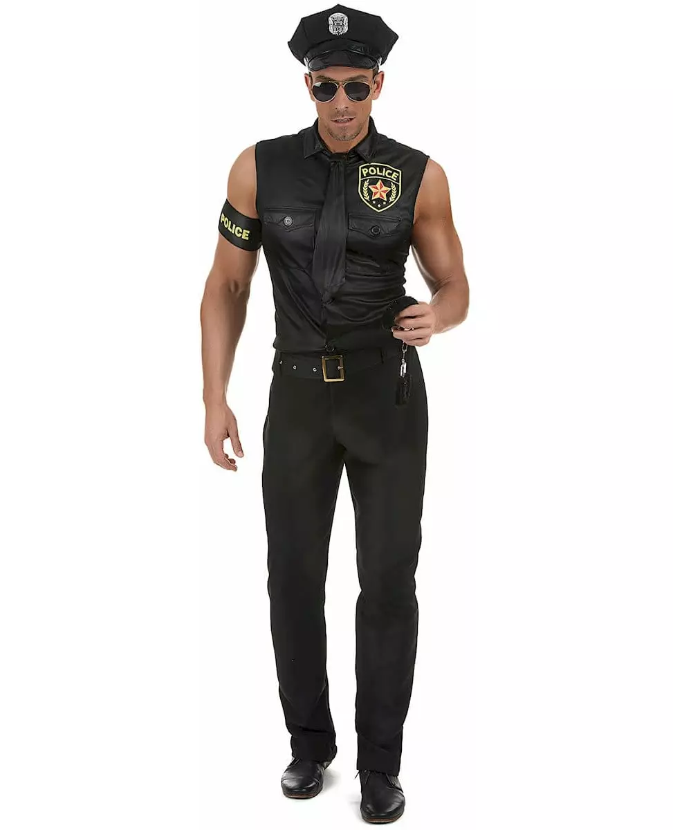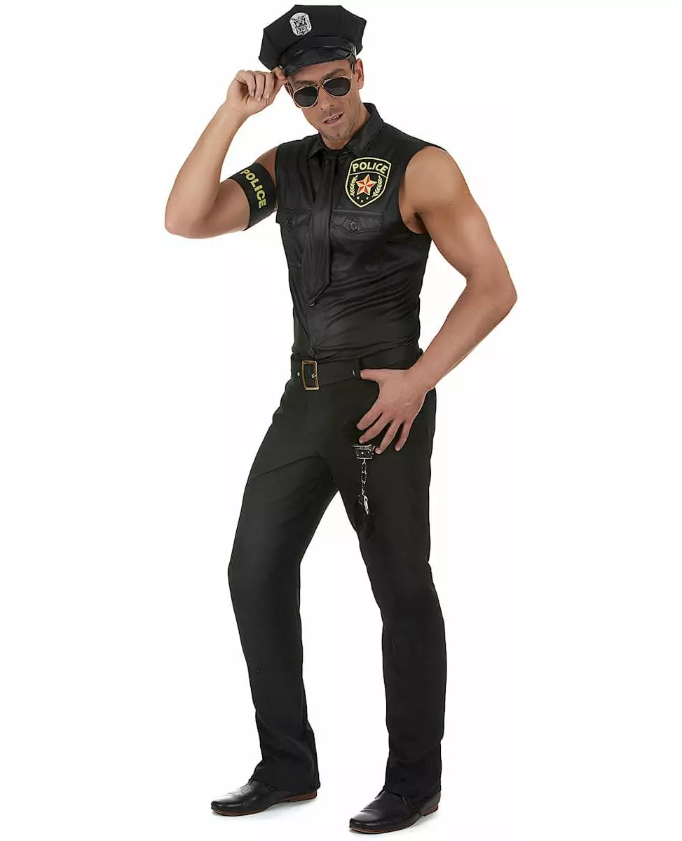 Du er arrestert! Dette sexy politibetjentkostymet er for menn og inkluderer en topp, bukser, en caps, et slips, et belte og et armbånd. (Briller, håndjern og sko er ikke inkludert). Toppen, som lukkes foran med plastknapper, er laget av et skinnende svart stoff som minner om lær. Stoffet er mykt og behagelig å ha på seg. Buksene, vide og laget av et mer matt stoff, lukkes foran med en glidelås. Beltet glir inn i buksehempene. Laget av tykk filt, lukkes den med en justerbar gullfarget metallspenne. Capsen har utmerket støtte som sikrer den karakteristiske formen til politicapser. Et sølvmerke er flokket foran (passer hodestørrelser opp til 59 cm). Til slutt vil borrelåsarmbåndet med ordene "POLICE" perfekt fullføre dette sexy politibetjentantrekket for å sikre at du får en fyrfull kveld på for eksempel et utdrikningslag! Inkludert tilbehør: Skjortebånd Buksebelte Armbånd Materiale: 100 % polyester Stell: Håndvaskbar Målinformasjon: For størrelse L, topplengde ca. 76 cm og bukser ca. 112 cm